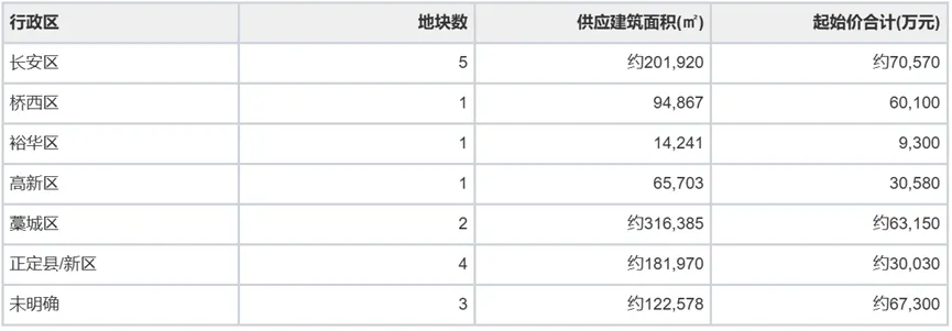 根据克而瑞数据监测,2026年1季度(含跨季供应)石家庄主城及周边共推出19宗涉宅/商服用地(其中藁城区[2026]001、高新区[2026]008为跨周期重推地块)。剔除重复记录后实际独立地块约17宗,总供应建筑面积约104万㎡,合计起始价约34.8亿元。分行政区与分用途统计如下:
