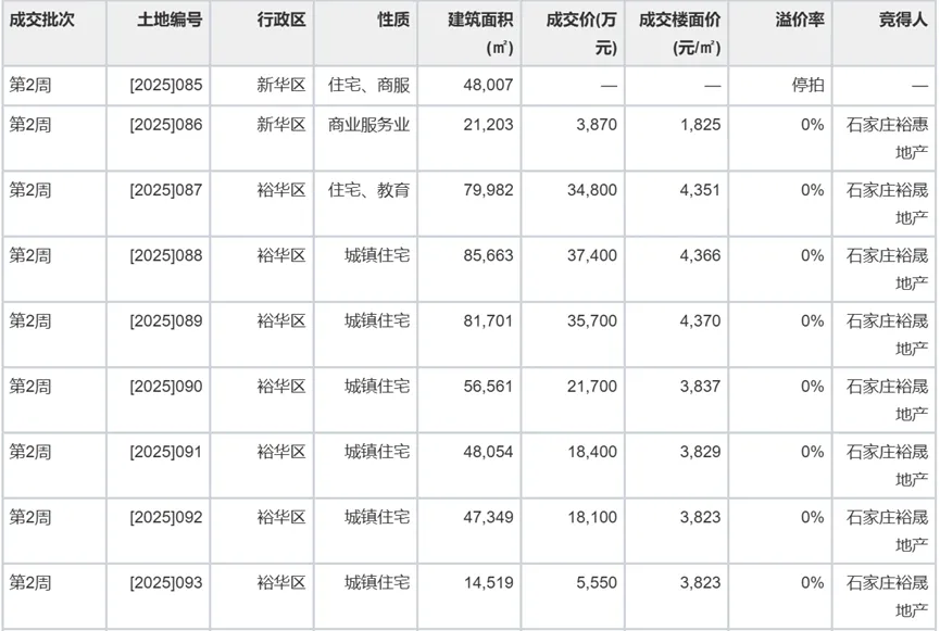•同批次由石家庄裕晟地产一揽子底价竞得7宗,合计建筑面积超41万㎡,楼面价区间3,823–4,370元/㎡;