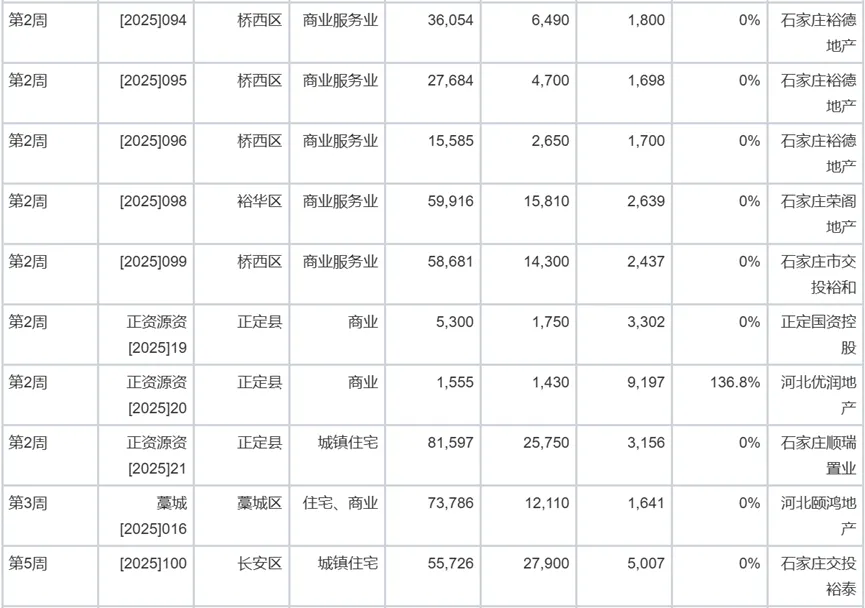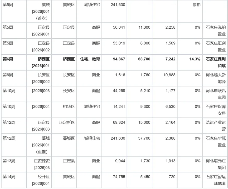成交14宗地块中,仅桥西区[2026]001地块溢价14.3%、正定一宗微型商业地块溢价,其余均为底价成交,显示开发商整体保持谨慎、精准的投资策略。