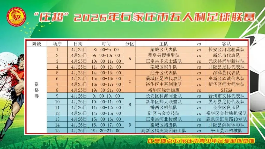 春日正好,战鼓催征。2026年4月25日,“庄超”石家庄市五人制足球联赛将在全市球迷的期待中正式打响。来自全市23个县(市)区的47支球队已整装待发,将在单败淘汰制的残酷赛场上,向冠军奖杯发起全力冲击。