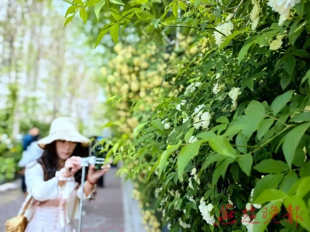 4月,石家庄市体育公园的木香花迎来盛花期,密密匝匝的蜜黄色小花沿墙如瀑倾泻而下,香气袭人,吸引了大批市民前来拍照打卡,成为社交媒体上热议的“网红花墙”。