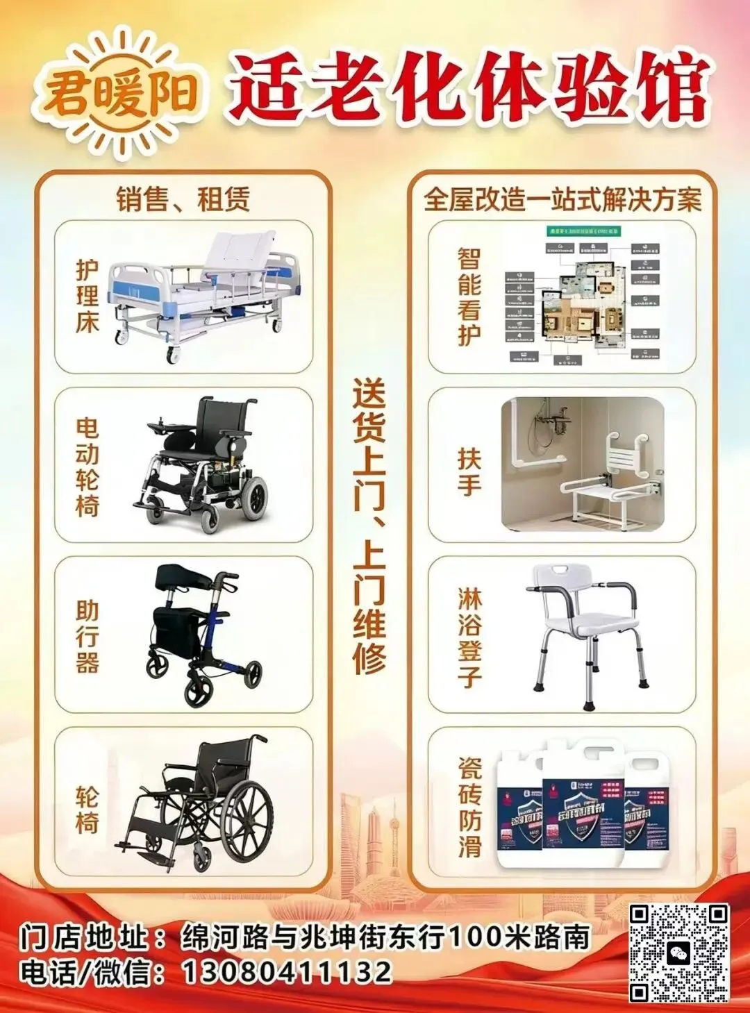石家庄君暖阳是本地一站式适老化解决方案服务商,主营护理床、爬楼机、电动、手动轮椅、血压计、防褥疮气垫、移位器等全品类适老化产品,同时重磅推出全新器械租赁服务,精准解决老人行动不便、上下楼难、日常出行不便等核心难题,让孝心不被距离困住。