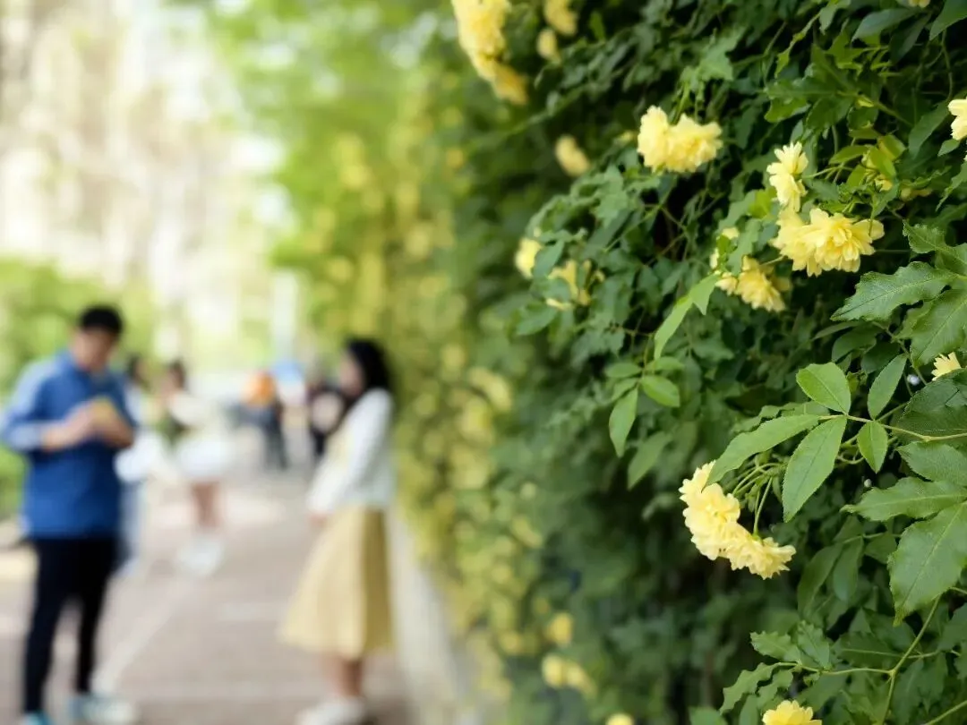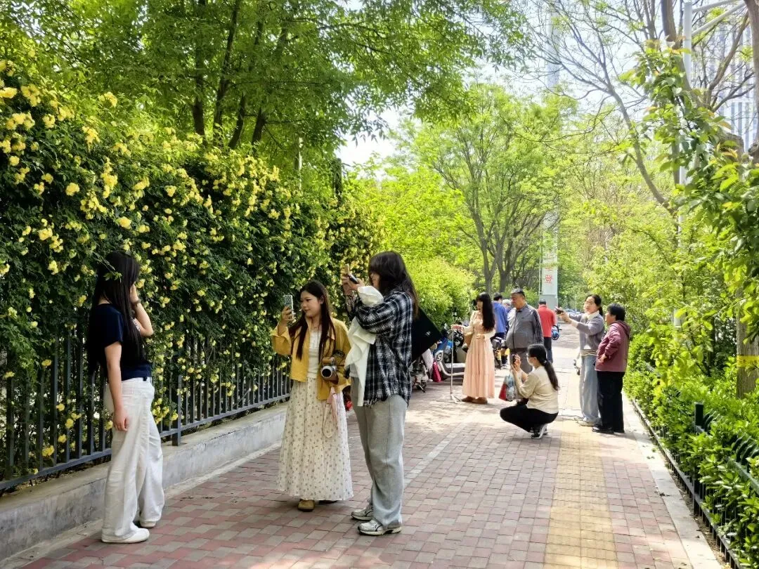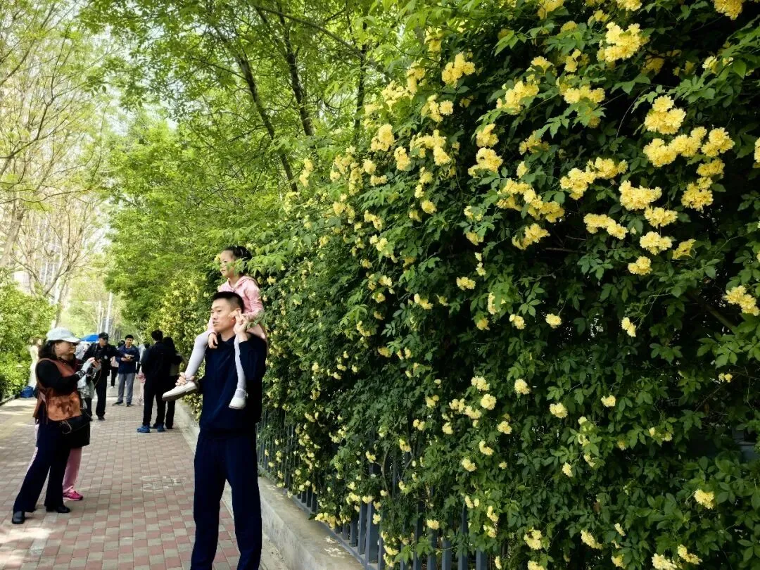 4月,石家庄市体育公园的木香花迎来盛花期,密密匝匝的蜜黄色小花沿墙如瀑倾泻而下,香气袭人,吸引了大批市民前来拍照打卡,成为社交媒体上热议的“网红花墙”。