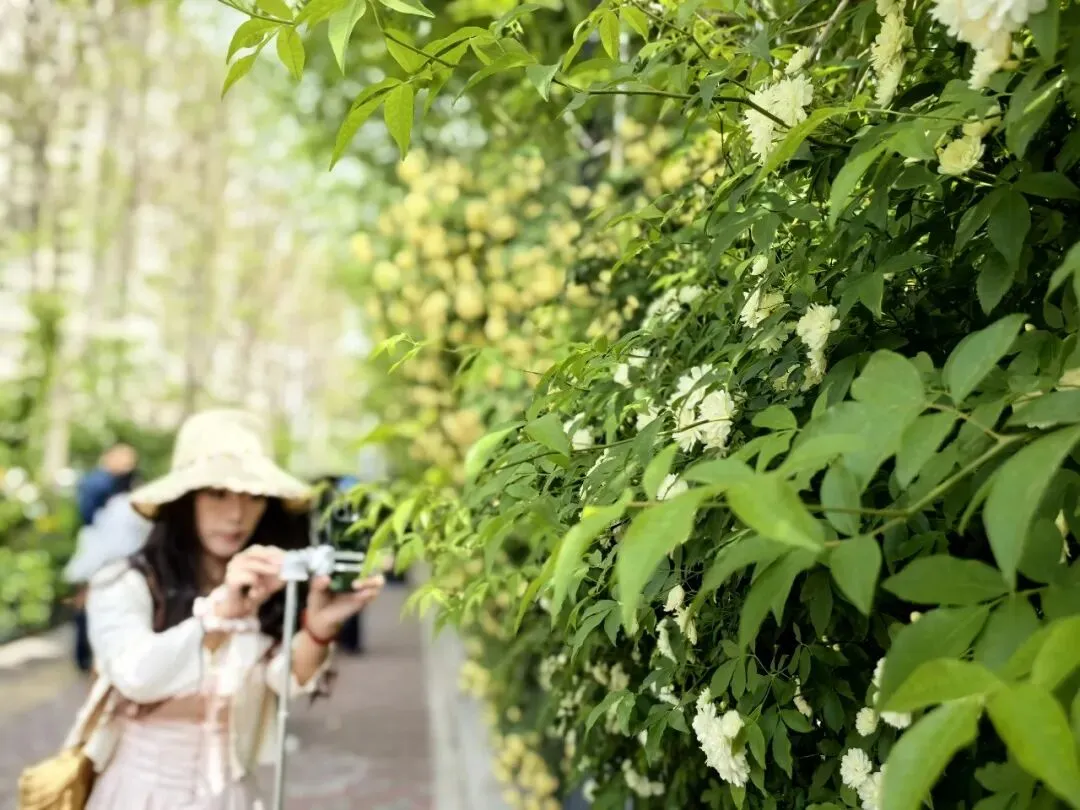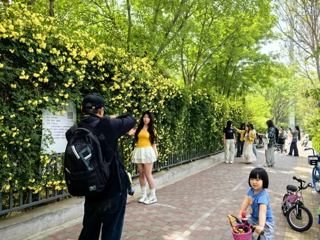 从早到晚,花墙前人流不断。清晨,有摄影师专程蹲守第一缕晨光,捕捉花朵在朝阳下的通透质感;傍晚,情侣们牵手而来,在花瀑下合影留念;还有不少家长带着孩子、老人结伴前来,在花墙前驻足观赏、拍照留念。手机、相机、自拍杆……各式拍摄设备齐上阵,人们用镜头记录下这一年一度的“4月限定美景”。