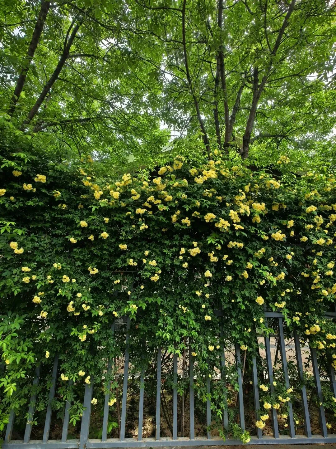 这面木香花墙位于体育公园街与祥泰路交叉口的东南角。昨天,记者在现场看到,一面数十米长的栅栏上,木香花层层叠叠、竞相绽放。藤蔓缠绕、绿叶点缀,蜜黄色花朵如瀑布般从栅栏垂落,花团锦簇,蔚为壮观。微风吹过,空气中弥漫着清雅的花香,令人流连忘返。