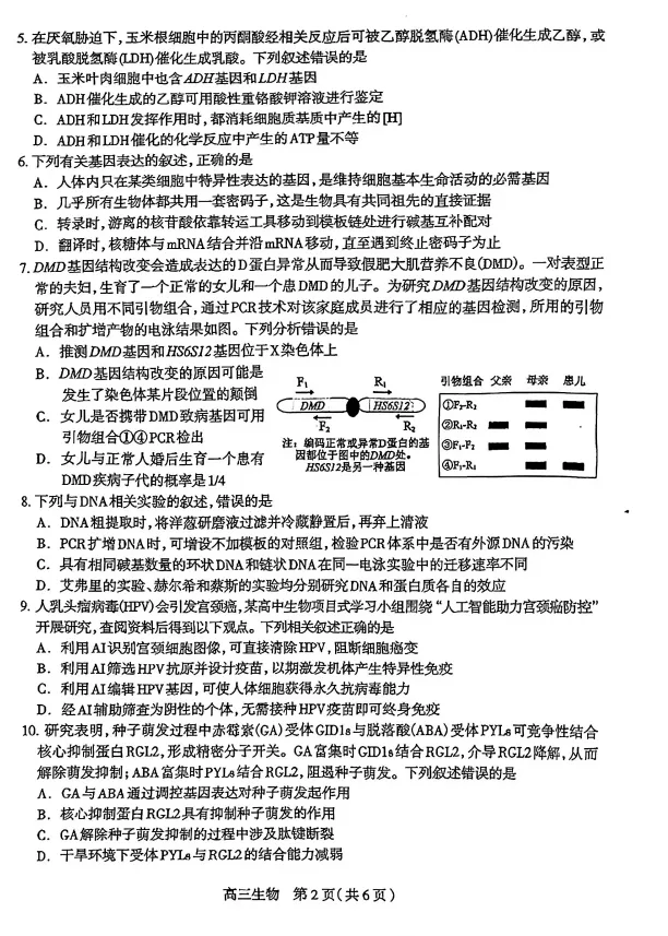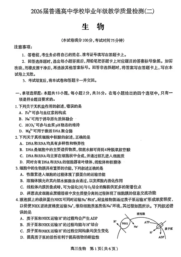 河北省2026届石家庄市高三教学质量检测(二) 【生物】试卷及答案