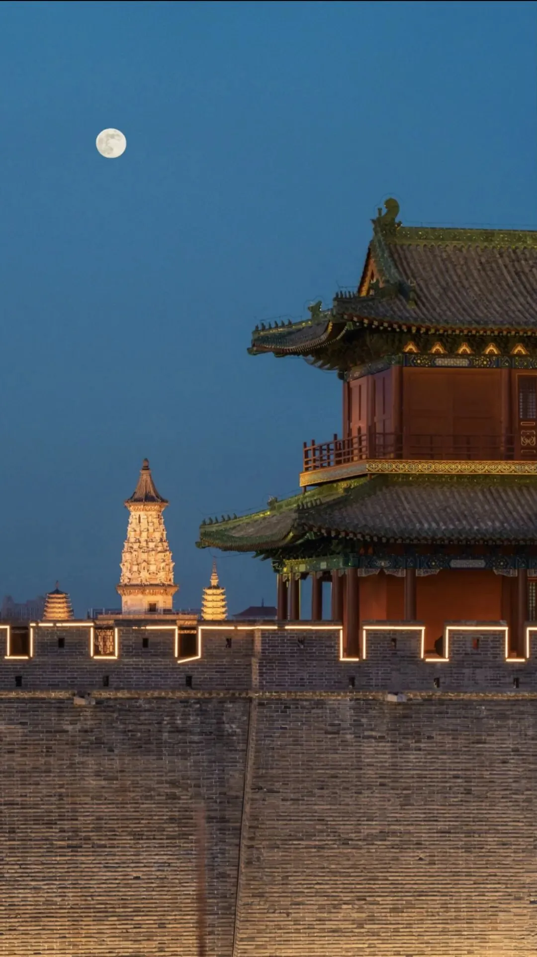 动态抓拍:撩帘子、推窗、低头抚琴、回头一笑……别总站着比✌️,动起来更有戏!必拍机位:走在穿堂长廊、雕花窗前,红墙竹影更是天然画框,随手一拍就是“深宅大院的故事感”。夕阳把古城染成琥珀色,看远处临济寺澄灵塔、凌霄塔、须弥塔、广惠寺华塔……错落有致地浮在天际线上。从左到右依次为广惠寺·华塔、开元寺·须弥塔、天宁寺·凌霄塔、临济寺·澄灵塔
