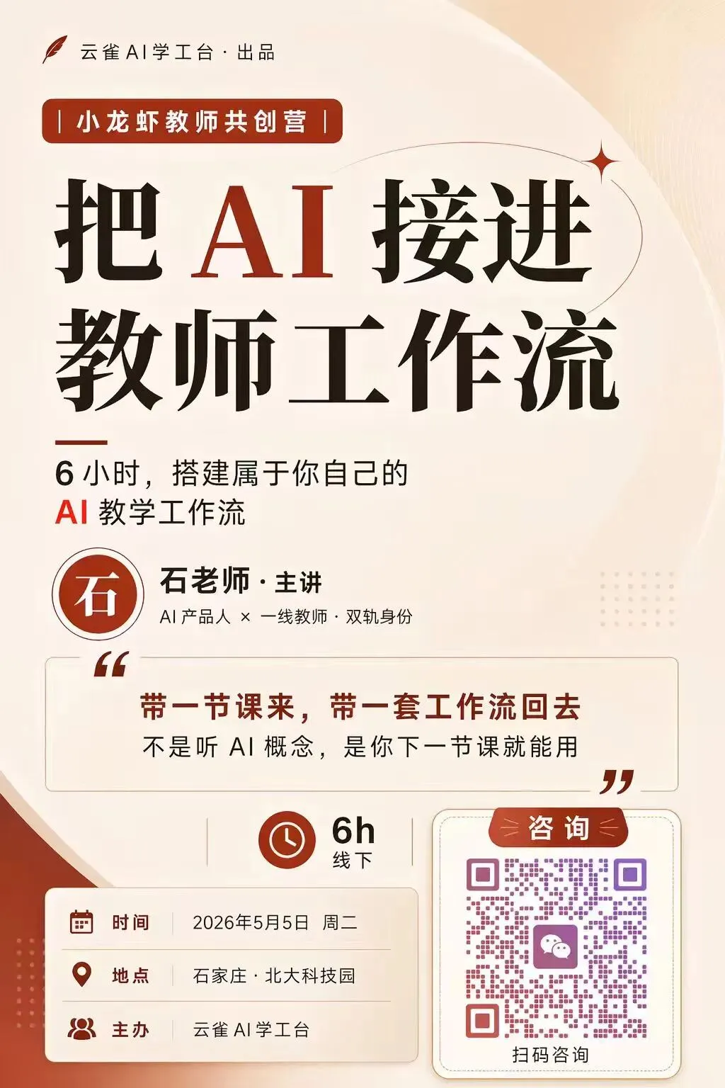 5 月 5 日,石家庄,6 小时,12 位老师,围绕真实课题做一次完整的 AI 教学工作流共创。