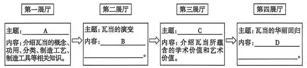 首先揣摩出题者意图,四个展厅对应四个主题,四个主题按文章顺序分别对应材料一四个部分。按这个逻辑来推导,A处对应材料一中1-4段,“瓦当的演变”对应5-8段,通过1-4段“最早”“应运而生”“开启……千年传奇”,关键词就是“由来”“产生”“起源”这一类。再结合本题的推演逻辑及生活常识,展厅一写“瓦当的由来”没有任何问题。但是另一个逻辑是主题和内容应当是高度契合的。但A项主题对应内容如“分类、制造工艺、制造工具”等在1-4段并没有直接体现,反而这些是在5-8段有所体现。再有“由来”“由来”是否能够涵盖“概念、功用、分类、制造工艺、制造工具”?这也是有逻辑问题的。所以不少同学答“瓦当的基本知识”“瓦当的介绍”也是有一定道理的。应当告诉学生的是,遇到这种情况,必须掌握一个答题技巧,就是把“由来”“基本知识”全部答上,确保万无一失。