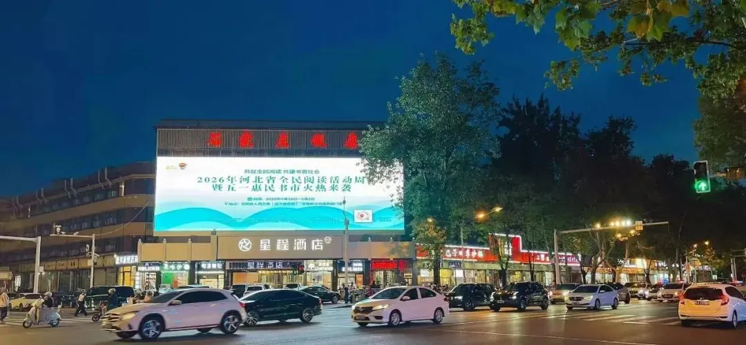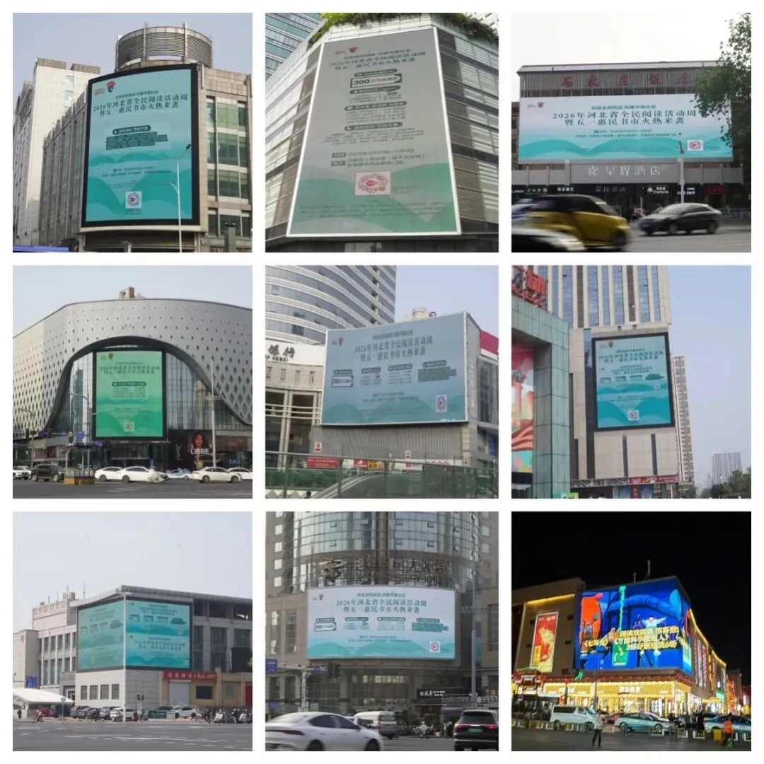 石家庄多个商圈室外大屏幕轮播五一惠民书市的消息