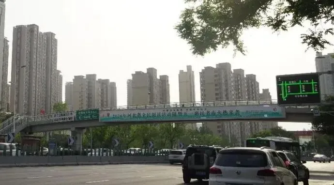 过街天桥拉起五一惠民书市的条幅