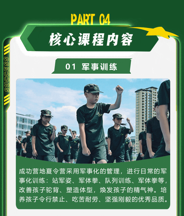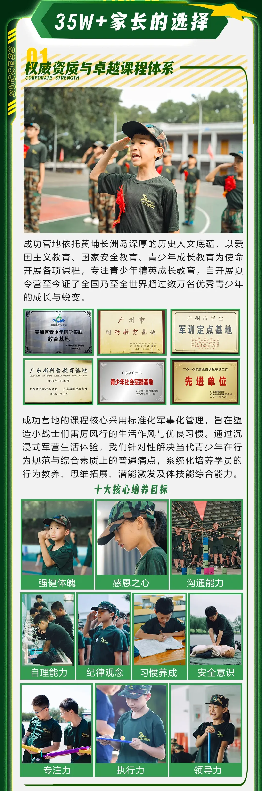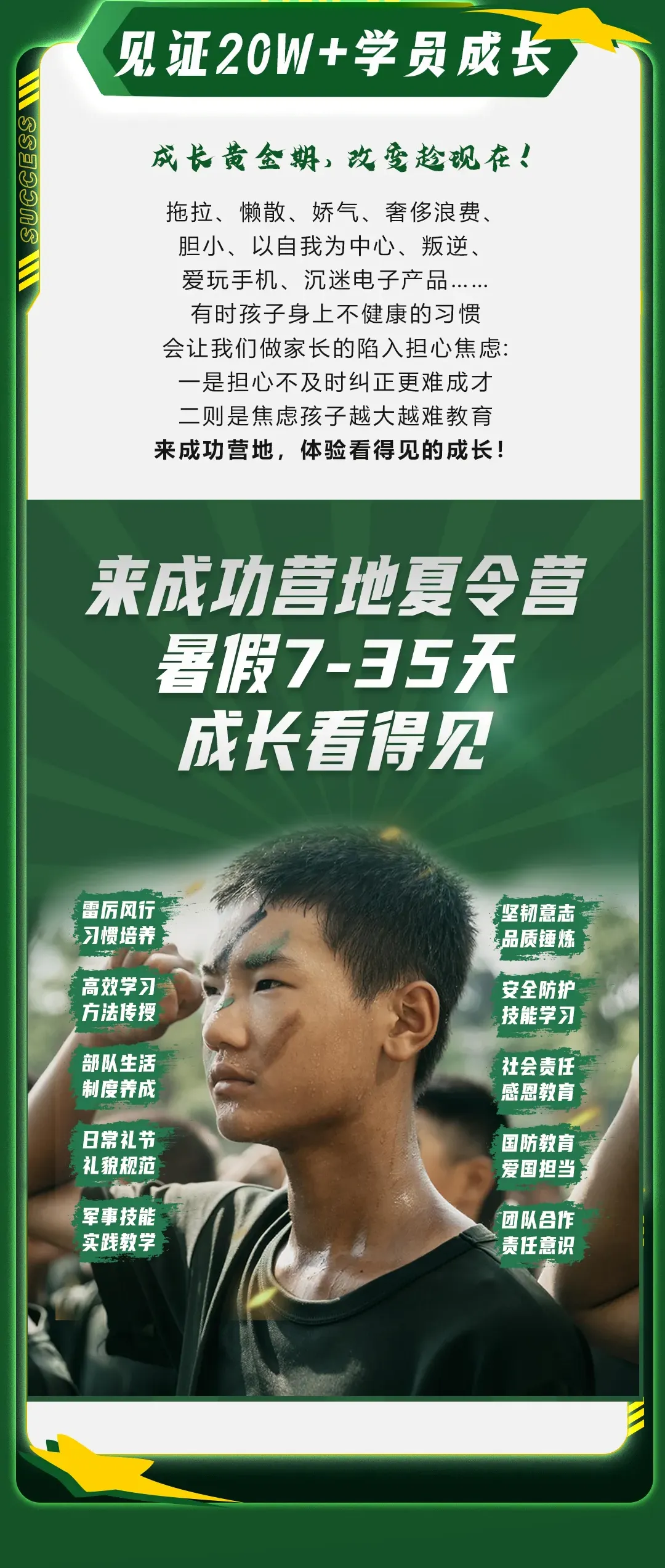 成功营地军事化特训营,是以军事训练为特色主题的青少年冬/夏令营,凭借多年的专业实践经验,融入丰富前沿的军事化课程体验,以培养孩子良好的行为习惯为切入点,让孩子体验军营生活,学习军人优良生活作风,锤炼孩子自觉、自律、自立、自强的优秀品格,增强行为责任感,以科学引导和心理干预帮助孩子完成五大核心修炼,搭建青少年全面成长、卓越发展的领袖思维体系。