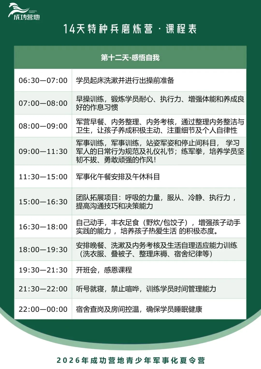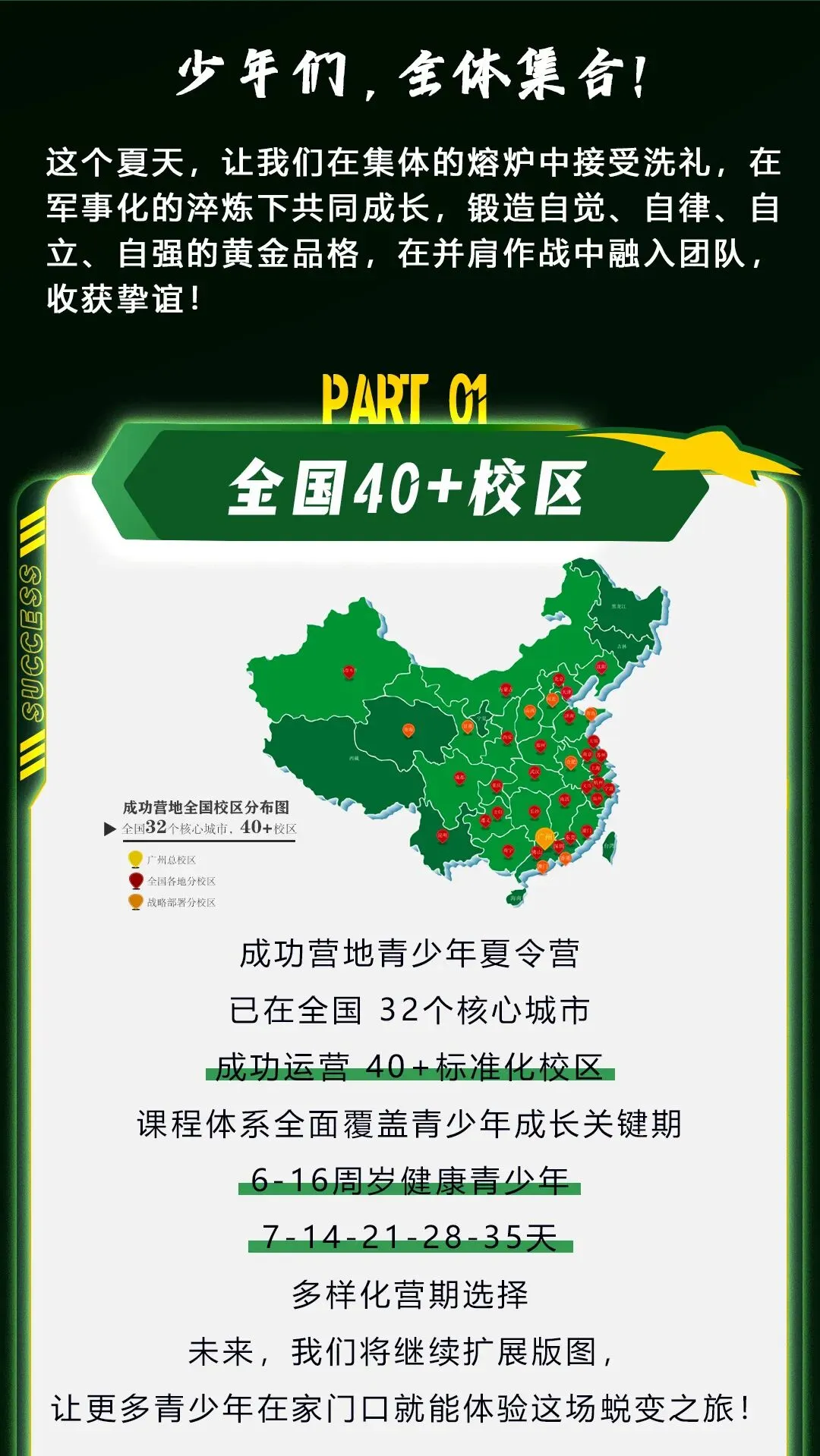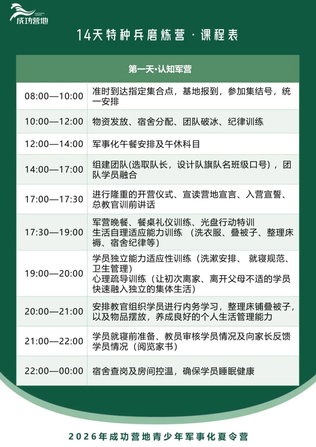 成功营地军事化特训营,是以军事训练为特色主题的青少年冬/夏令营,凭借多年的专业实践经验,融入丰富前沿的军事化课程体验,以培养孩子良好的行为习惯为切入点,让孩子体验军营生活,学习军人优良生活作风,锤炼孩子自觉、自律、自立、自强的优秀品格,增强行为责任感,以科学引导和心理干预帮助孩子完成五大核心修炼,搭建青少年全面成长、卓越发展的领袖思维体系。