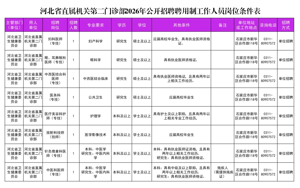 2026年省卫生健康委直属事业单位河北省直属机关第二门诊部拟公开招聘专业技术岗位人员8名。具体招聘人数和岗位条件详见《河北省直属机关第二门诊部2026年公开招聘聘用制工作人员方案》附件1:《河北省直属机关第二门诊部2026年公开招聘聘用制工作人员岗位条件表》,其中专业参考教育部《授予博士、硕士学位和培养研究生的学科、专业目录》、《普通高等学校本科专业目录》、《普通高等学校高职高专专业参考目录(试行)》设置。