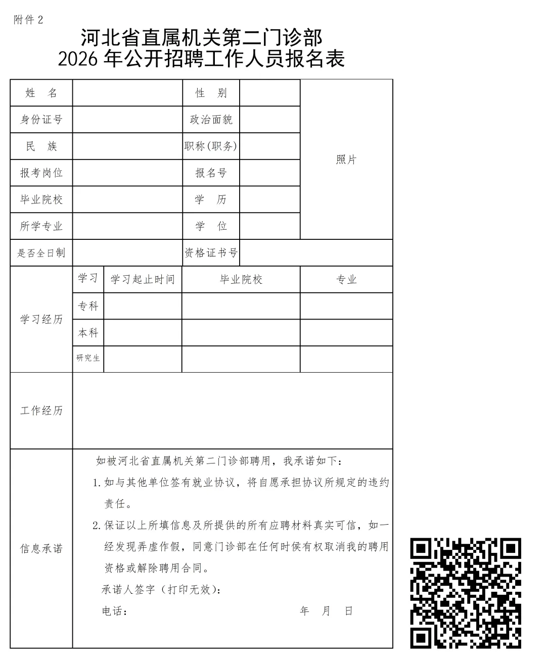1.报名方式:报名采取现场报名方式。现场报名须填写《河北省直属机关第二门诊部2026年公开招聘工作人员报名表》(附件2),并提供以下材料:个人简历、本人身份证、各阶段毕业证书(学历学位证书)、各阶段教育部学历证书电子注册备案表、执业证书、资格/职称证书、获奖证书等原件及复印件、2张近期同底1寸免冠照片。