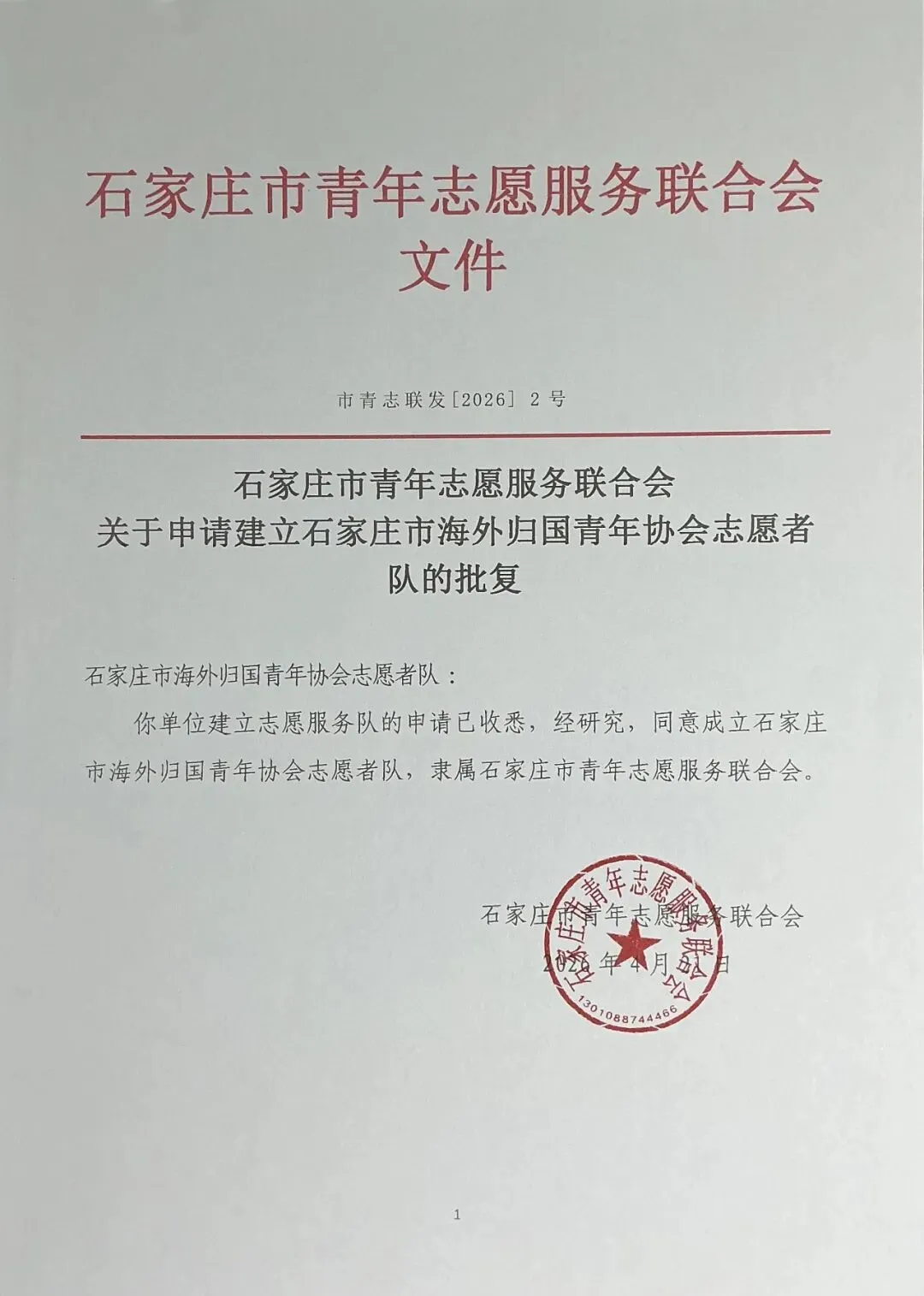 近日,石家庄市海外归国青年协会申请组建志愿者队获正式批准,【石家庄市海外归国青年协会志愿者队】正式成立,标志着协会公益服务迈向专业化、常态化、体系化新阶段,海归青年服务社会、助力城市发展再添坚实载体。