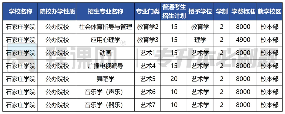 从上述数据可以看出,2026年河北专升本招生计划中,石家庄学院招生7个专业总计100人,就读校区均在校本部。