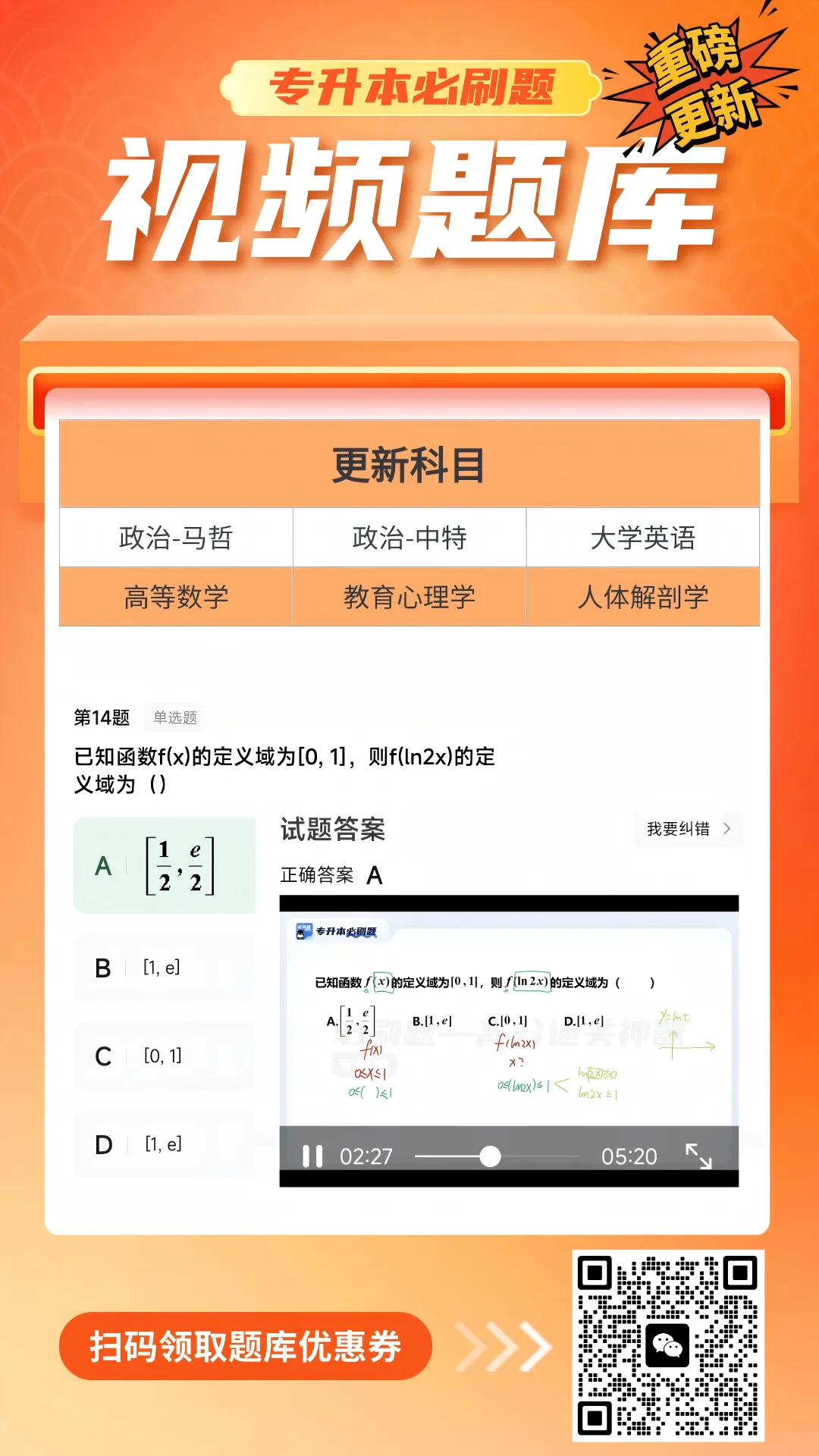 【专升本必刷题】重磅上线【视频题库】,每道题都是老师精选出来的,都有文字版解析和视频解析(注:视频解析需要次数包,现在开通会员可赠送少量次数包,用完后需单独购买,会做的题可以不看视频解析,看文字解析足矣)