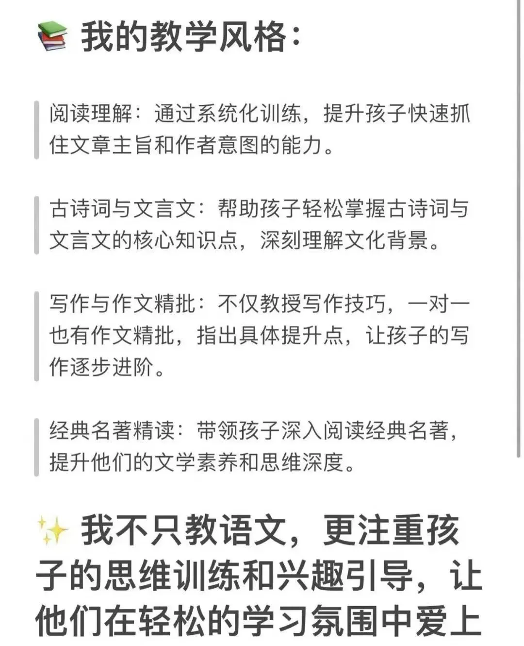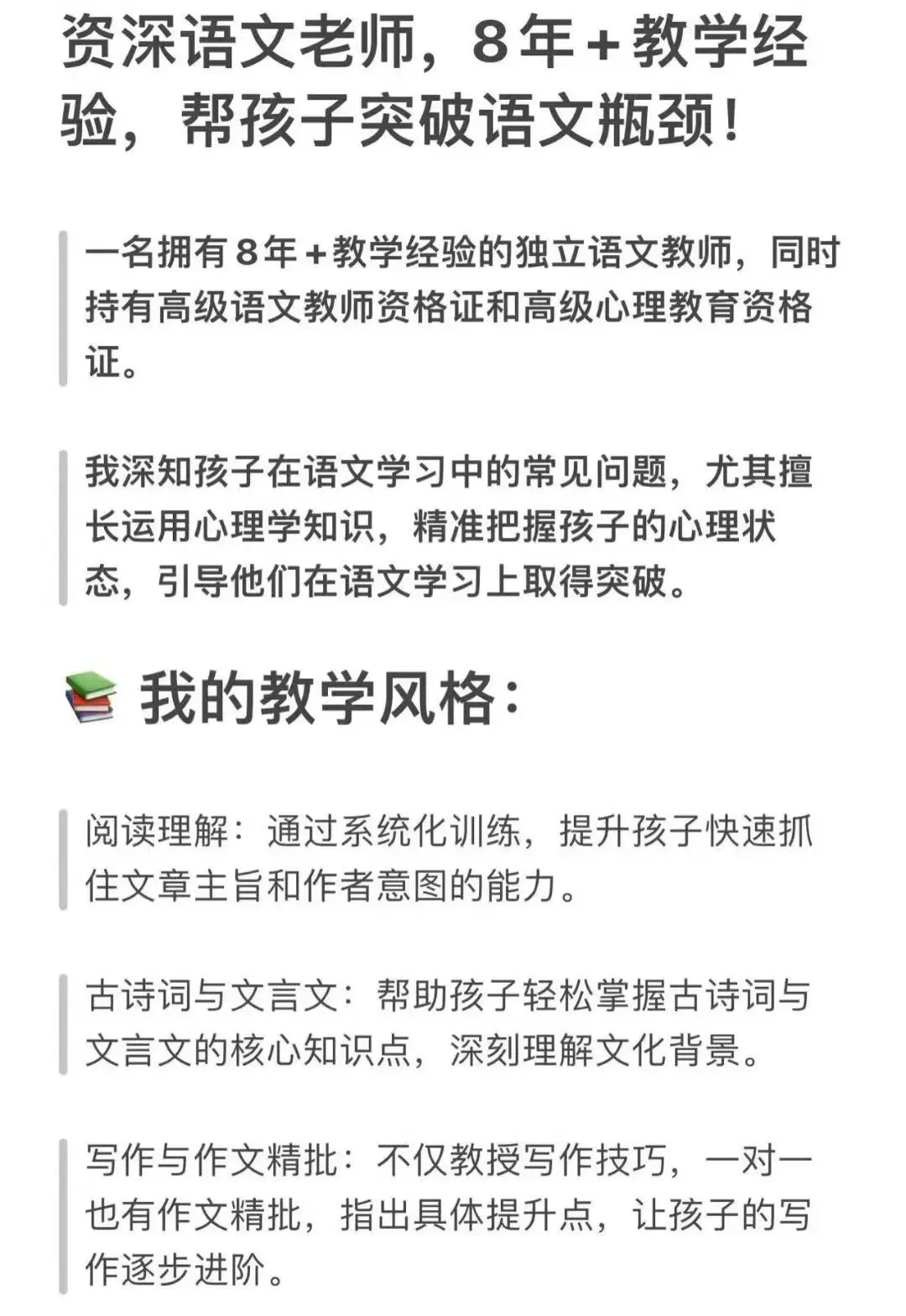 一名拥有8年+教学经验的独立语文教师,同时持有高级语文教师资格证和高级心理教育资格证。