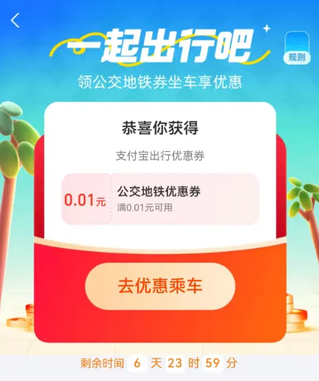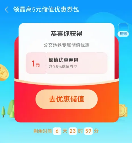 免费领取随机金额乘车优惠券,刷码乘车时直接抵扣。