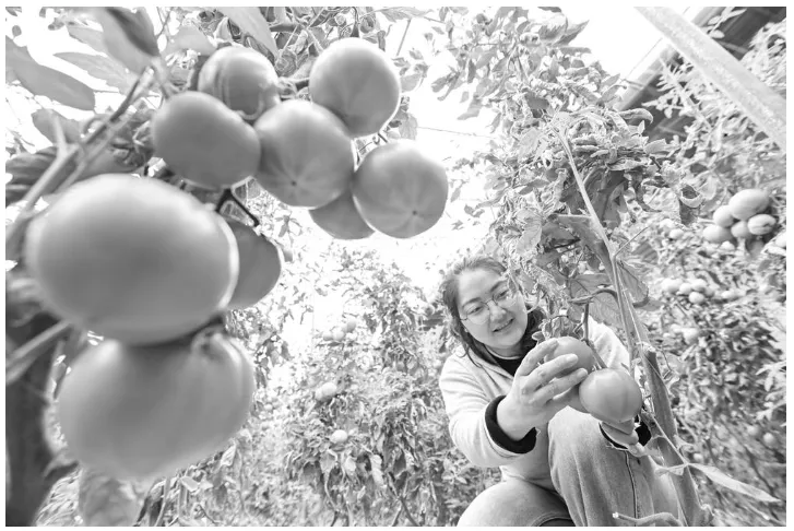大棚内,一株株西红柿长势喜人,藤蔓上挂满了累累硕果。色泽红润的西红柿从绿叶中探出头来,从各地而来的游客们除了采摘果蔬,还用镜头记录田园乐趣,在沉浸式农事活动中感受浓浓的乡村烟火气。