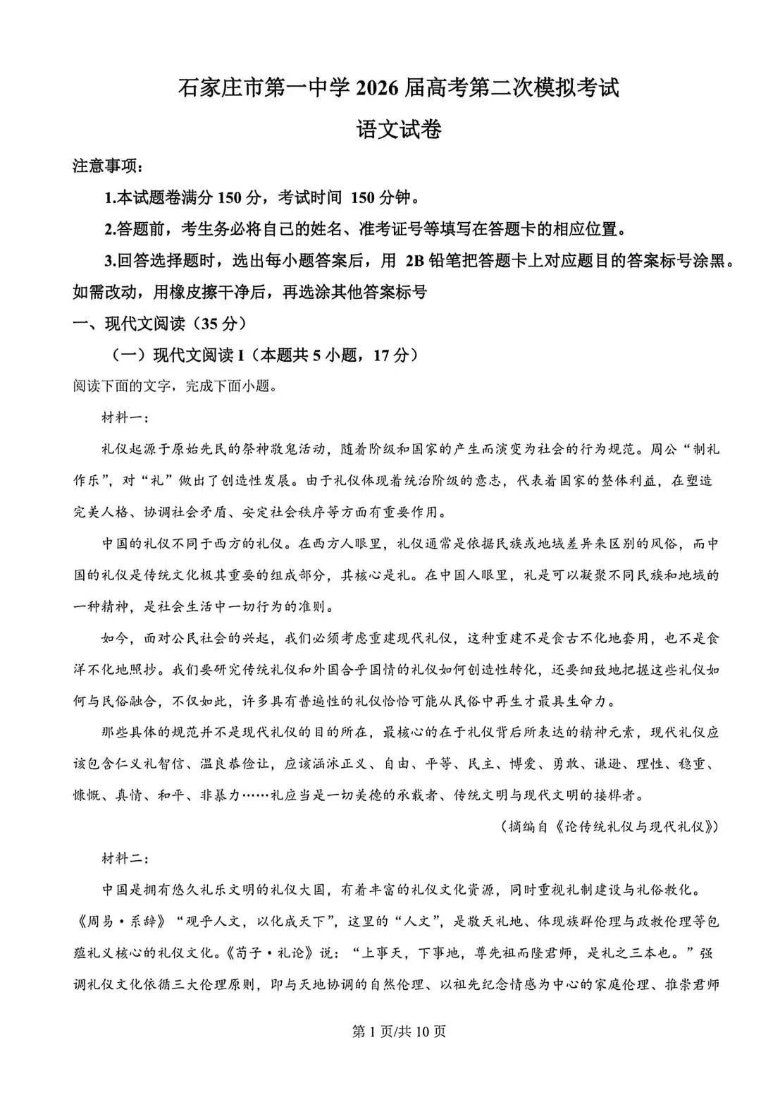 >石家庄一中2026高三第二次模拟语文试卷及答案