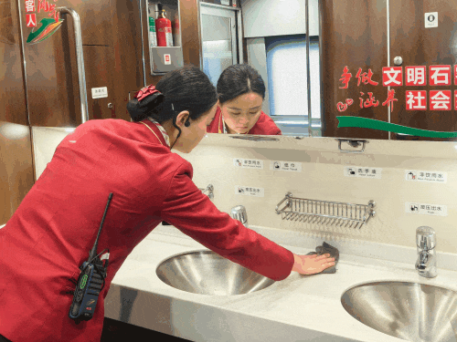 近日,动集车队动3组值乘D89次列车,利用长大运行区间,深度清理电茶炉积垢,集中整治洗面间、通风窗等区域卫生,全力打造干净整洁、舒适舒心的乘车环境。(动集车队 魏汶宏)