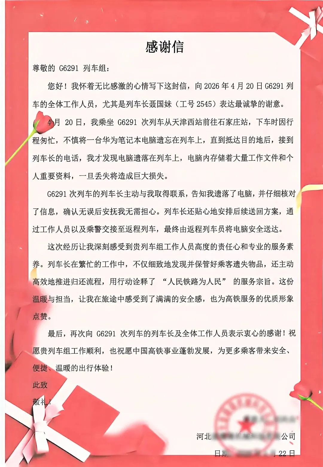 4月20日,高铁三队天津14组值乘G6291次列车,班组为旅客找回遗失的贵重物品并及时归还,事后,旅客送来感谢信表达谢意。(高铁三队 聂国妹)