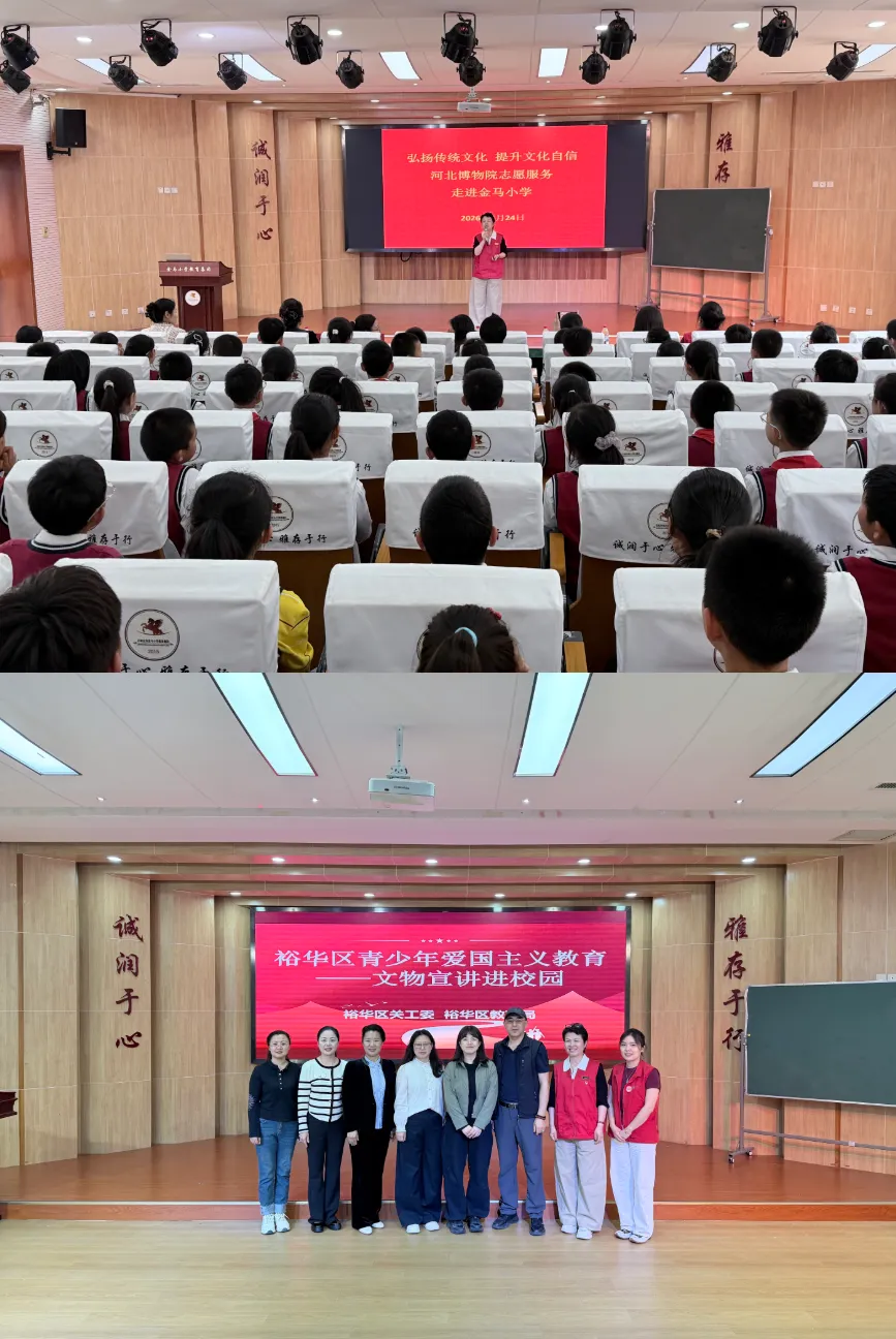 4月24日,石家庄市裕华区关工委、裕华区教育局联合河北博物院,在石家庄市金马小学教育集团(金马校区)举办裕华区青少年爱国主义教育文物宣讲进校园活动。 河北博物院专业讲解员带领同学们走近历史,细致生动地介绍了中山古国文字以及中山国时期的透雕龙凤纹铜辅首、错金银铜版兆域图、错金银虎噬鹿铜屏风座、西汉长信宫灯、刘胜金缕玉衣等13件珍贵国宝级文物。在讲解过程中,穿插了趣味问答互动,引导同学们深度感知文物底蕴、体悟传统文化内涵。