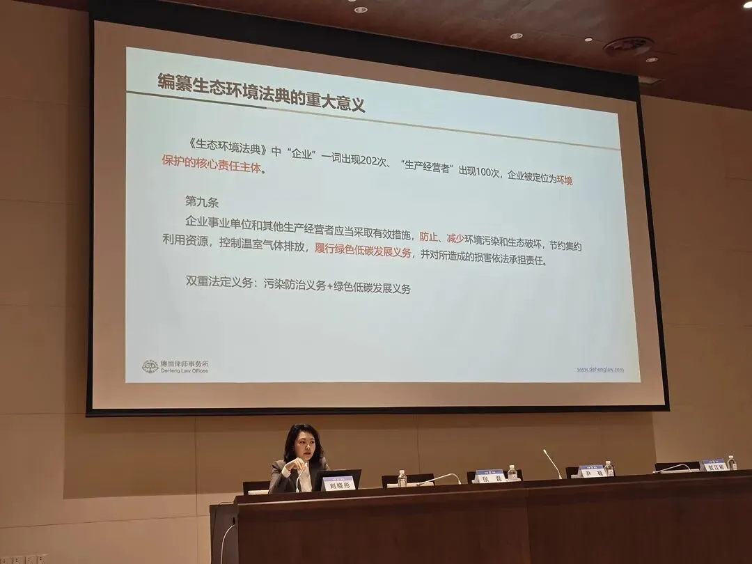 本次活动围绕涉企行政检查规范化与生态环境法律风险防范两大核心议题展开,刘晓彤律师以“法典遵循——企业环境合规体系的重塑”为题,结合新施行的《生态环境法典》进行专题宣讲。