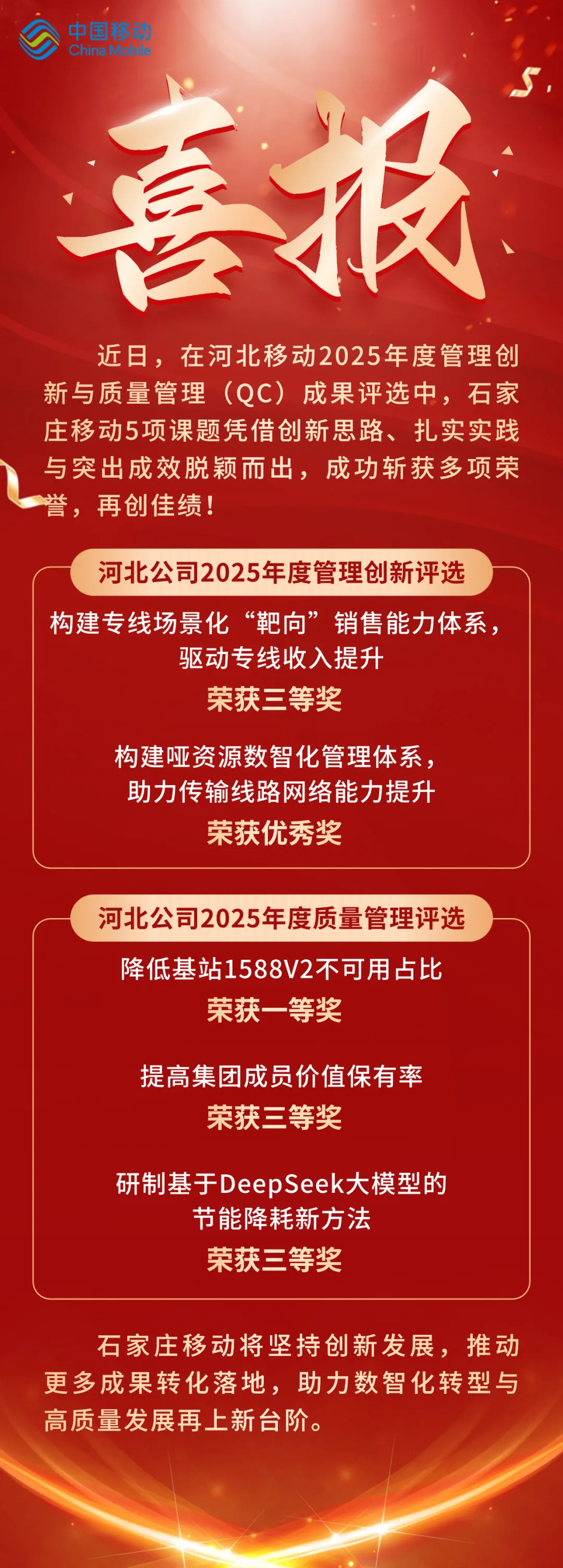 >斩获5项奖项!石家庄移动管理创新与质量管理成果创佳绩