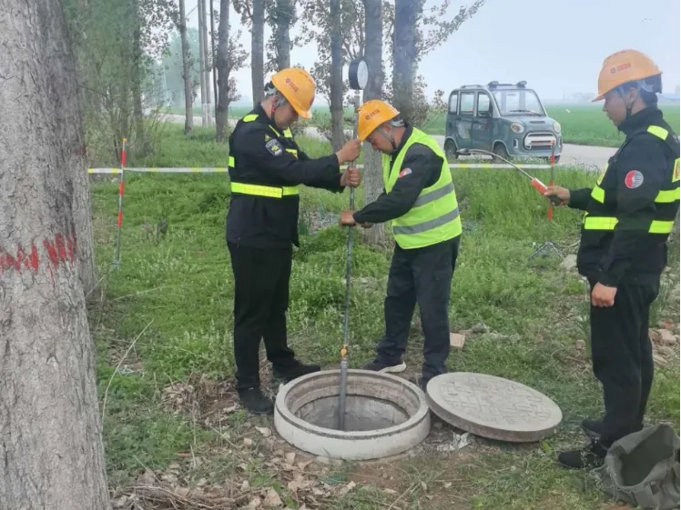 在作业现场,三名身着反光背心、佩戴安全帽的抢修人员分工明确:两人操作压力检测设备深入井下管道,实时监控压力数据;另一人手持可燃气体检测仪,对作业区域进行全方位安全监测。现场提前拉设警戒线隔离作业区,设置“燃气抢修 禁止通行”警示牌,并配备两具灭火器,全程落实规范操作,全力保障作业及周边环境安全。