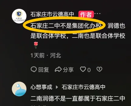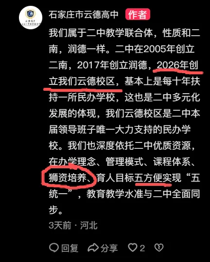 第一,学校在宣传中多次称“石家庄二中不是集团化办校,润德、二南是联合体学校,云德与它们性质一致”“2026年二中创立云德校区”,但从官方信息来看,二南、润德均为石家庄二中教育集团的正式成员校,属于非营利性“社会组织”,有官方发布的集团化办学合作协议与明确的权责划分,而云德高中为石家庄市学府教育发展有限公司100%持股,“二中教学联合体”身份,目前仅有学校自身的宣传,无石家庄二中官方发布的正式合作公告、合作协议与背书。