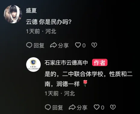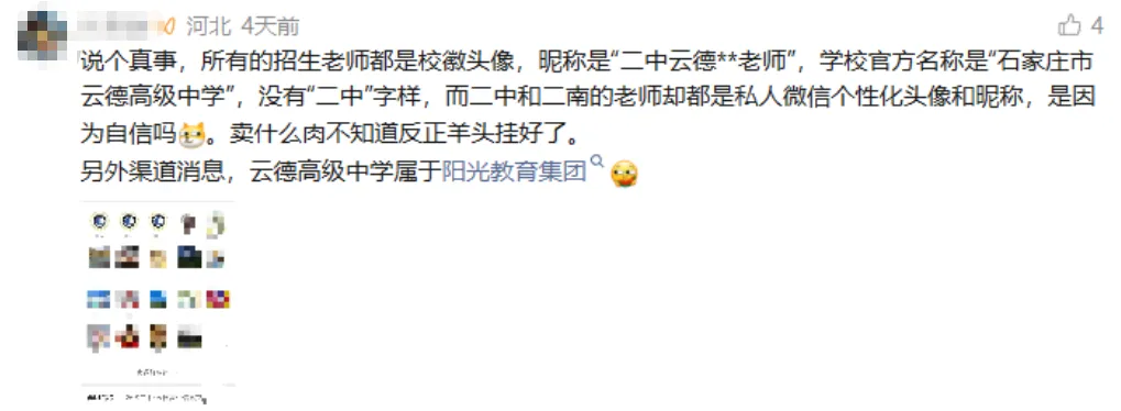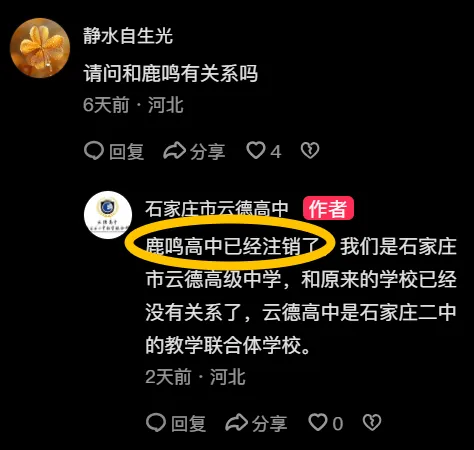 第五,学校目前在品牌宣传中,非常刻意的在隐瞒办学主体的历史延续性,已经引发了家长的广泛质疑。学校在官方回复中称“鹿鸣高中已经注销,和原来的学校没有关系”,但工商信息明确显示,学校并非主体注销后重新设立,而是2026年2月完成了企业名称变更,从“石家庄市鹿鸣高级中学有限公司”变更为“石家庄市云德高级中学有限公司”,统一社会信用代码完全进行了延续,办学资质的主体也未发生变化。学校刻意割裂与原鹿鸣高中的关联,隐瞒办学主体的历史延续性,本质上是对家长的信息误导,一旦家长了解真实情况,将直接引发严重的品牌信任危机。