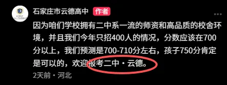 第二,宣传名称有时与注册名称不符,存在误导家长的隐患。学校在宣传中多次使用“二中・云德”的名称。并且,其在市场监管局与教育局核准的官方名称为“石家庄市云德高级中学有限公司”,名称中不含“二中”字样,该表述极易让家长误认为学校是石家庄二中的直属校区,对学校的办学主体与性质产生误判,违反招生宣传的真实性原则。