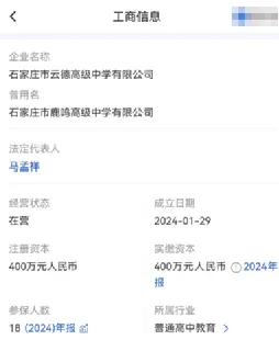 公开渠道显示,2026年2月,原“石家庄市鹿鸣高级中学有限公司”正式完成了工商名称变更,以“石家庄市云德高级中学有限公司”的全新主体亮相了石家庄教育市场。