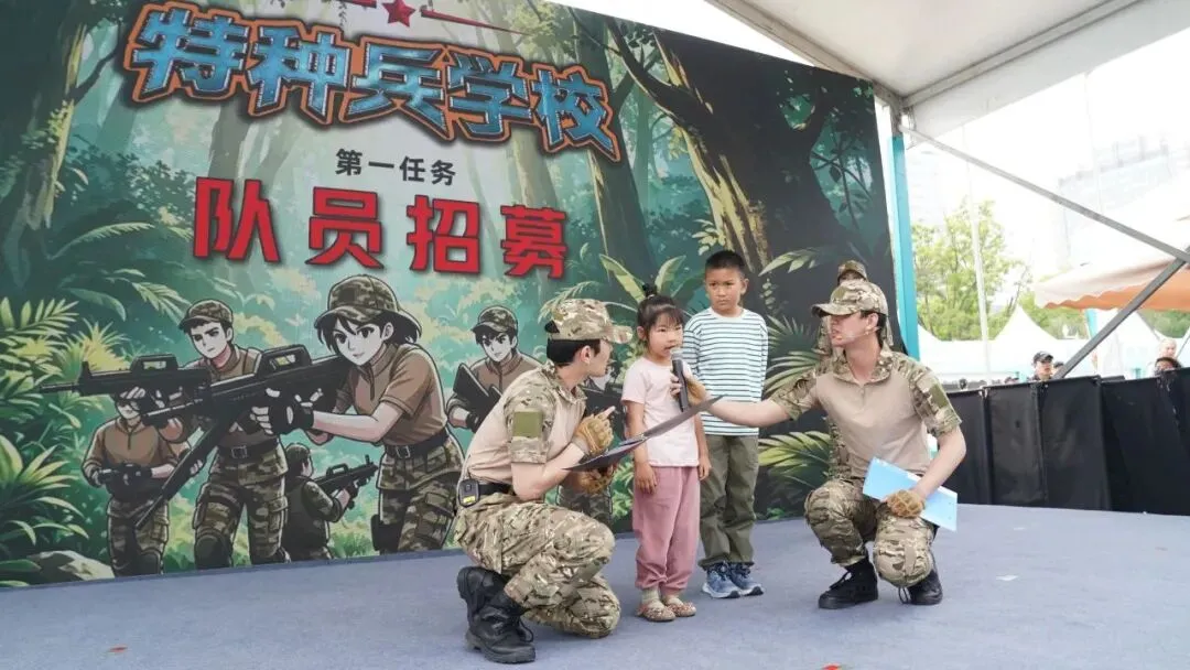 现在有《特种兵学校》的快闪表演,演员们还拉着小朋友们一起玩军事闯关游戏,那叫一个热闹!