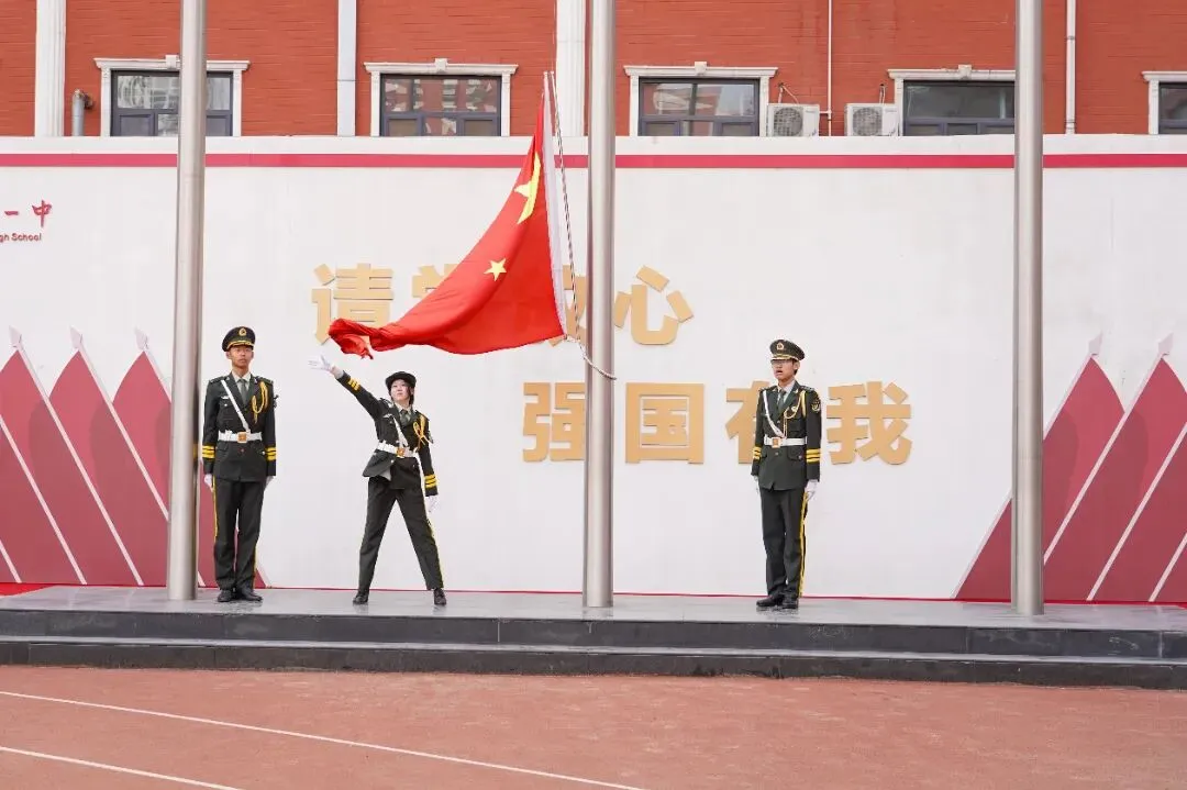 全体师生肃立,目光追随着五星红旗。在雄壮的国歌声中,国旗冉冉升起,迎风飘扬。春风拂过,红旗猎猎作响,爱国之情在每个人心中激荡,庄严而神圣的时刻深深铭刻在心间。