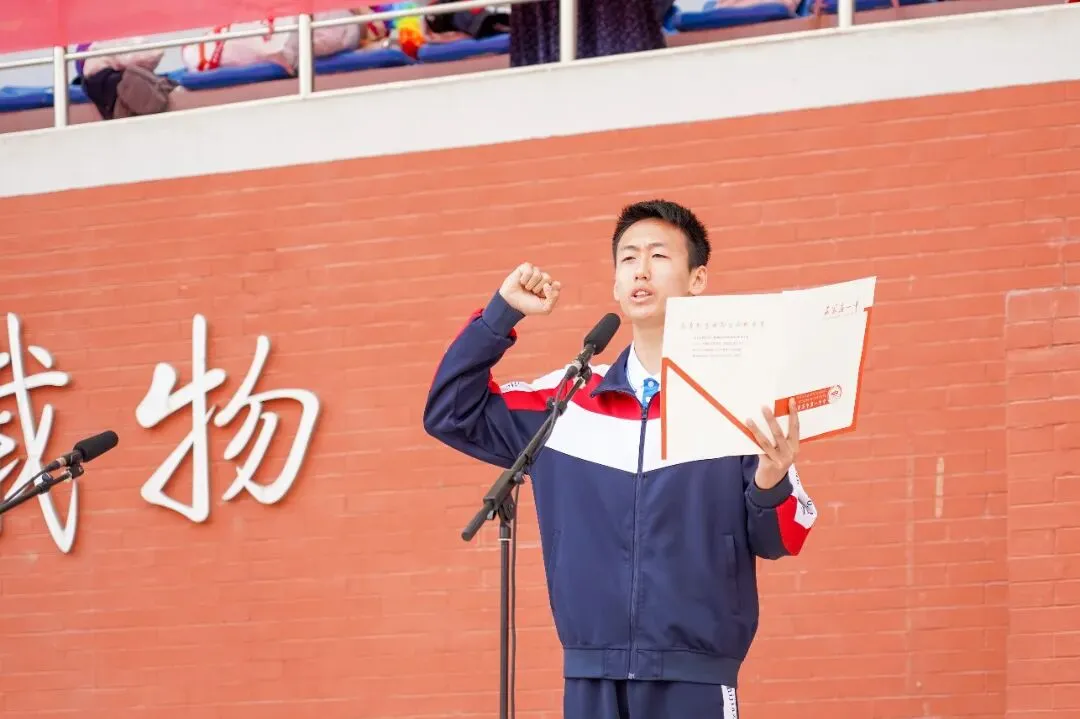 运动员代表高举右拳,面向全场庄严宣誓。铿锵的誓言回荡在体育场上空,这是对体育精神的庄严承诺,更是对青春梦想的坚定回应。