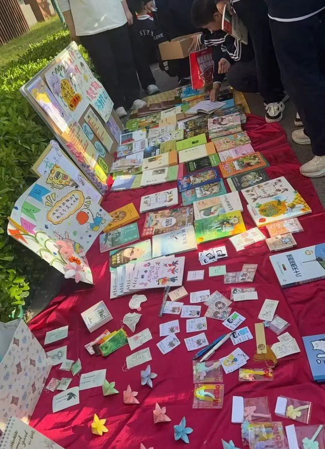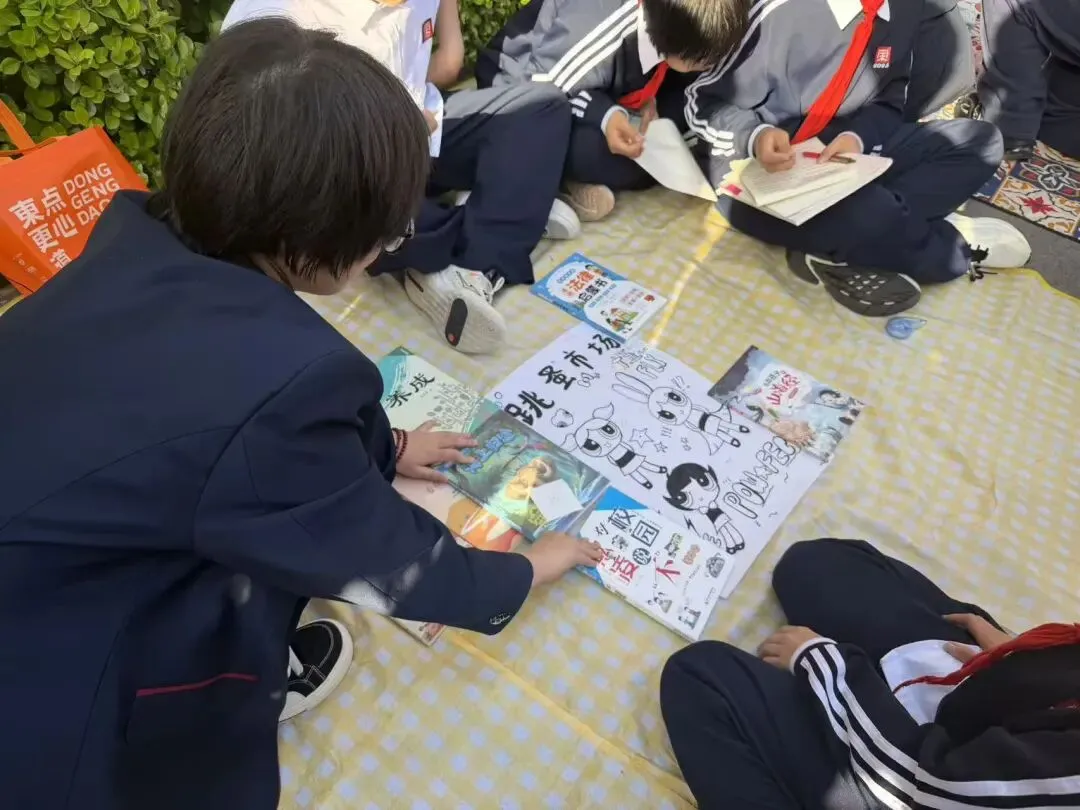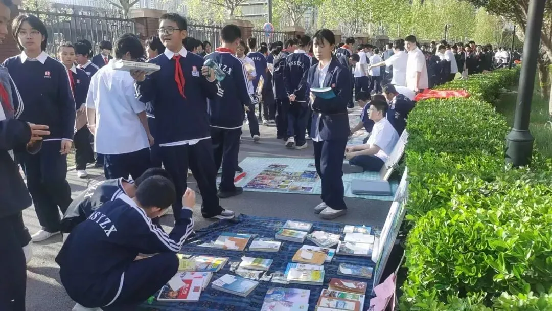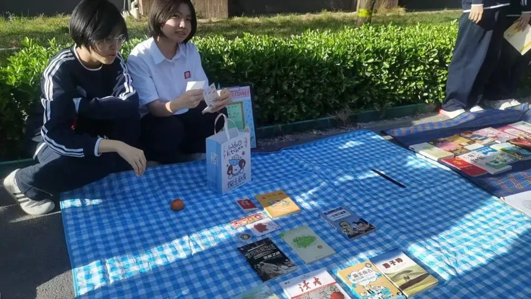 活动现场,指定区域变身趣味十足的图书市集。各班摊位整齐排列,海报醒目、陈列美观,课外读物、绘本、名著、科普百科等琳琅满目,书签、笔记本等文创好物点缀其间。
