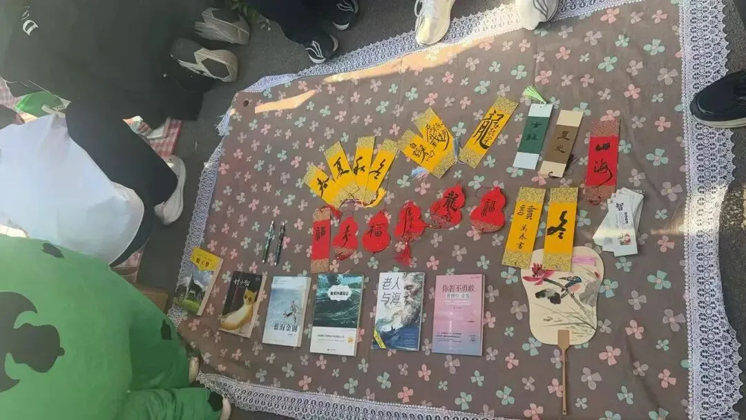 一句句朗朗上口的摊主口号、一张张色彩明快的宣传海报、一件件整齐归类的书籍文创,尽显同学们的巧思与热情,为这场书香盛会做好充分准备。