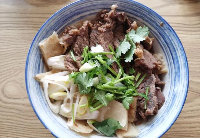 老马家的牛肉用的是黄牛腱子,提前一天就开始炖,十几种香料配比是祖传的,炖出来的肉纤维分明,一撕就开,汤头浓到挂壁,但不腻,饼是死面饼,烙得外焦里韧,浇上热汤三十秒,饼吸足了汤汁但还保持着口感,这一碗端上来,汤、肉、饼三样东西各自成立,合在一起又是另一个东西,这就是手艺。