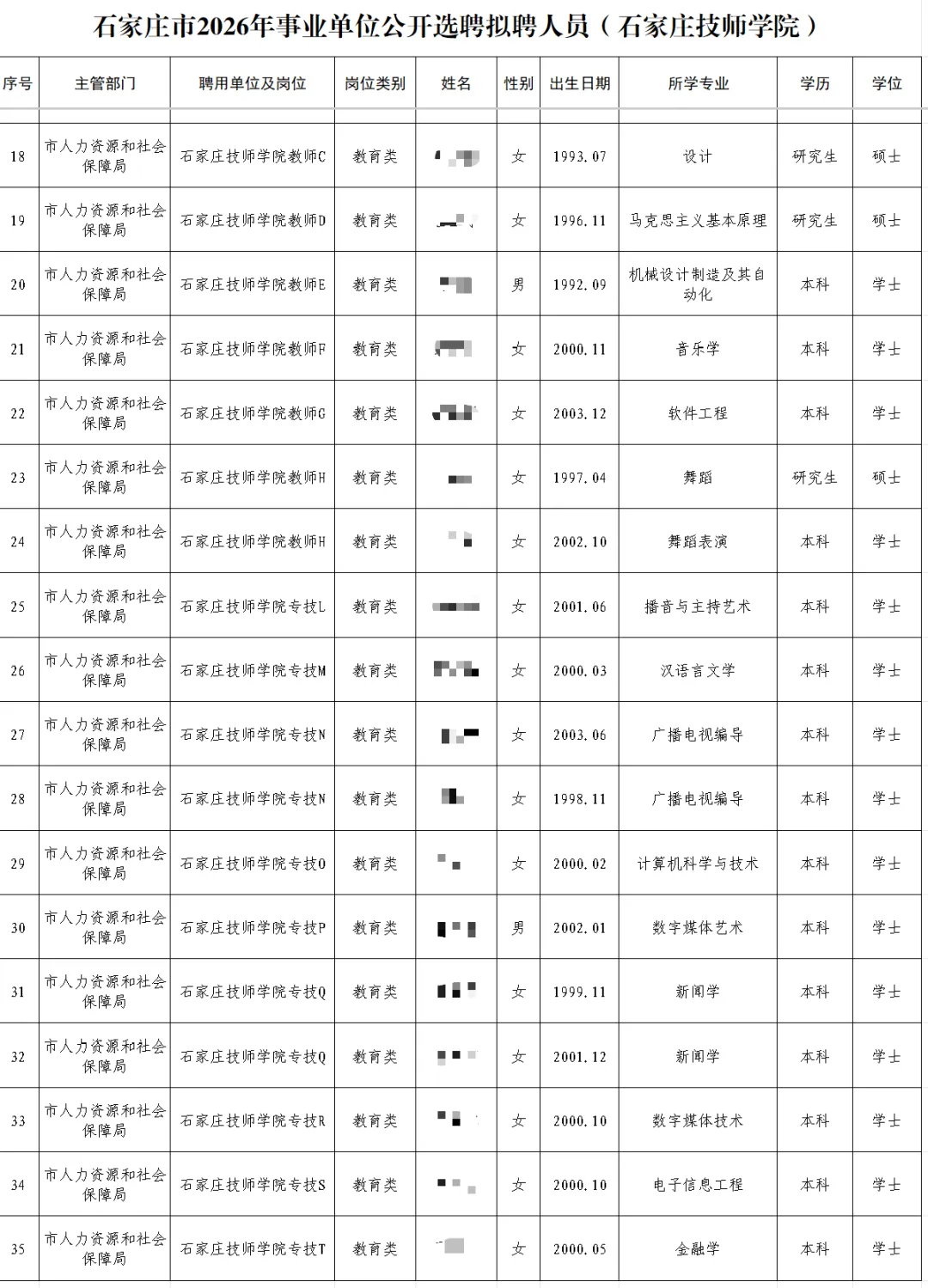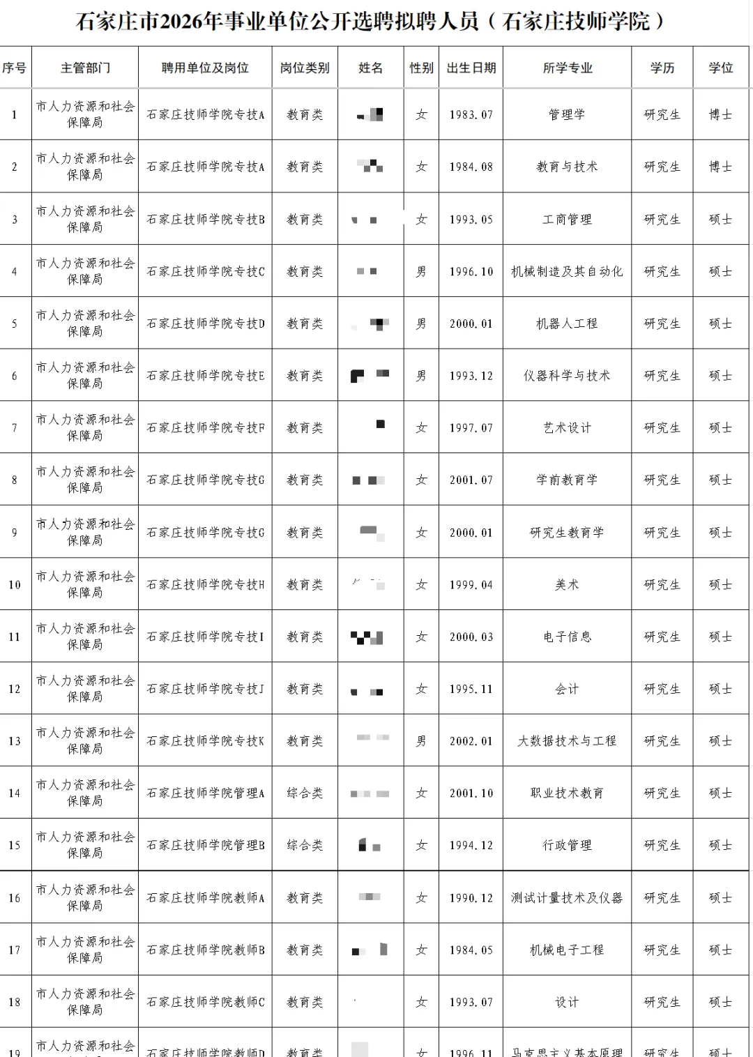 石家庄技师学院2026年事业单位公开选聘拟聘人员公示
