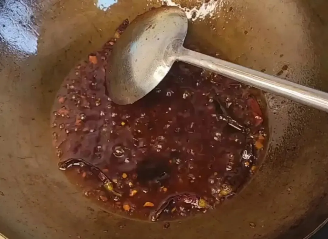 第二步锅里面加入食用油,放入洋葱块,大蒜,八角,开小会炸到金黄,然后把香料捞出来扔掉。接着把泡好的干辣椒段放进去,然后加入火锅底料,蒜蓉辣酱,番茄酱,黄豆酱继续开小火慢慢的炒出红油。