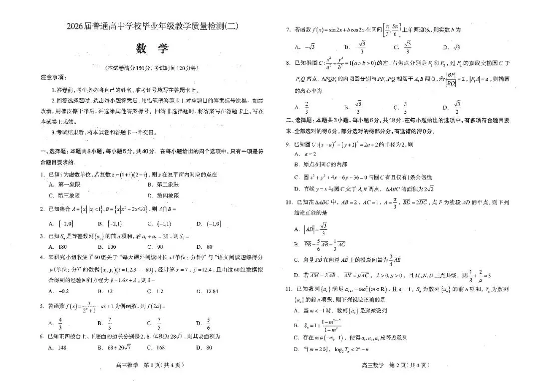 >2026年石家庄高三数学二模