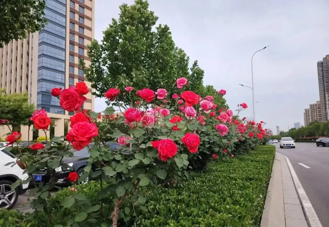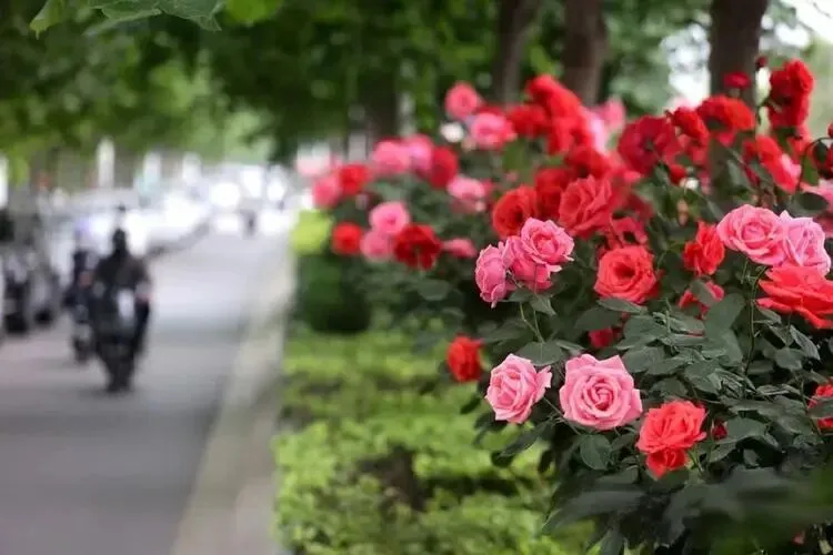 裕华路、中华大街、联盟路等城市主干道两侧,月季树亭亭而立,高挑的枝干托起满树繁花,花朵硕大饱满,色彩浓艳夺目,或热烈似火,或温婉如霞,在阳光下肆意舒展,形成一道道震撼人心的视觉风景线,行人路过,无不驻足凝望,沉醉在这满城芳华里。
