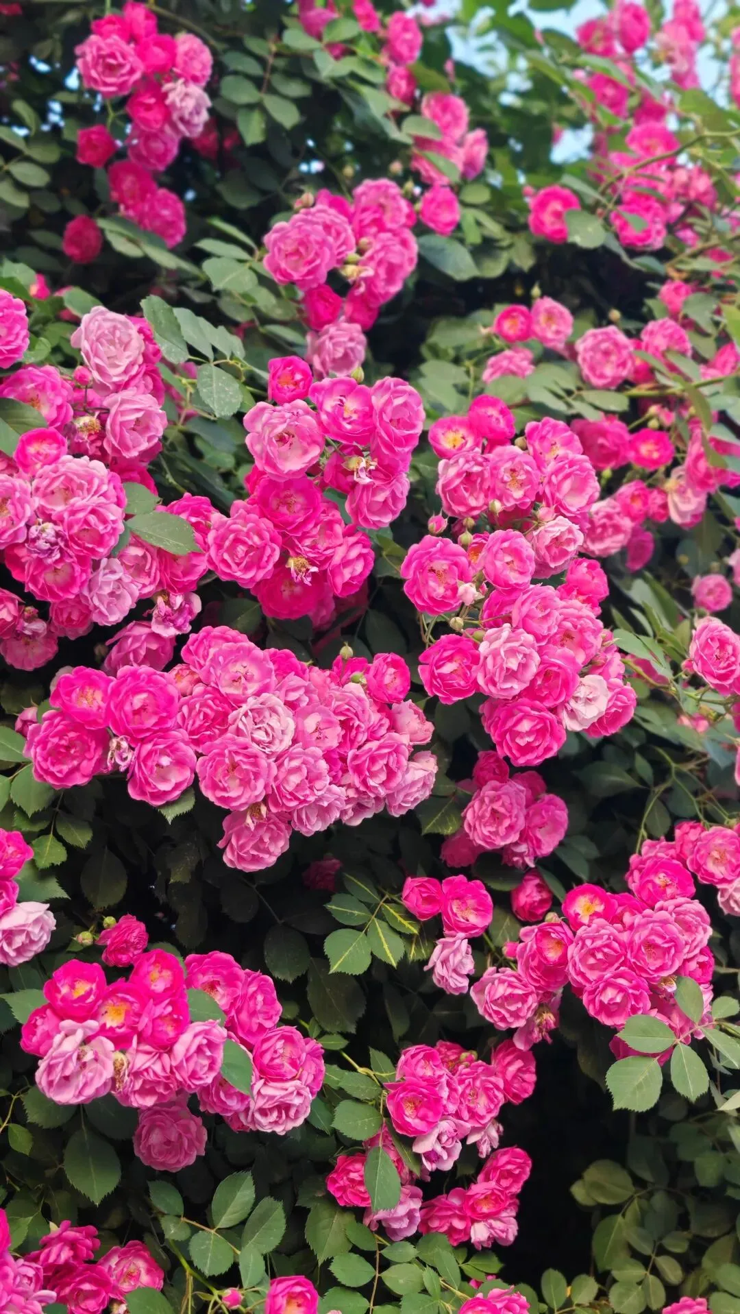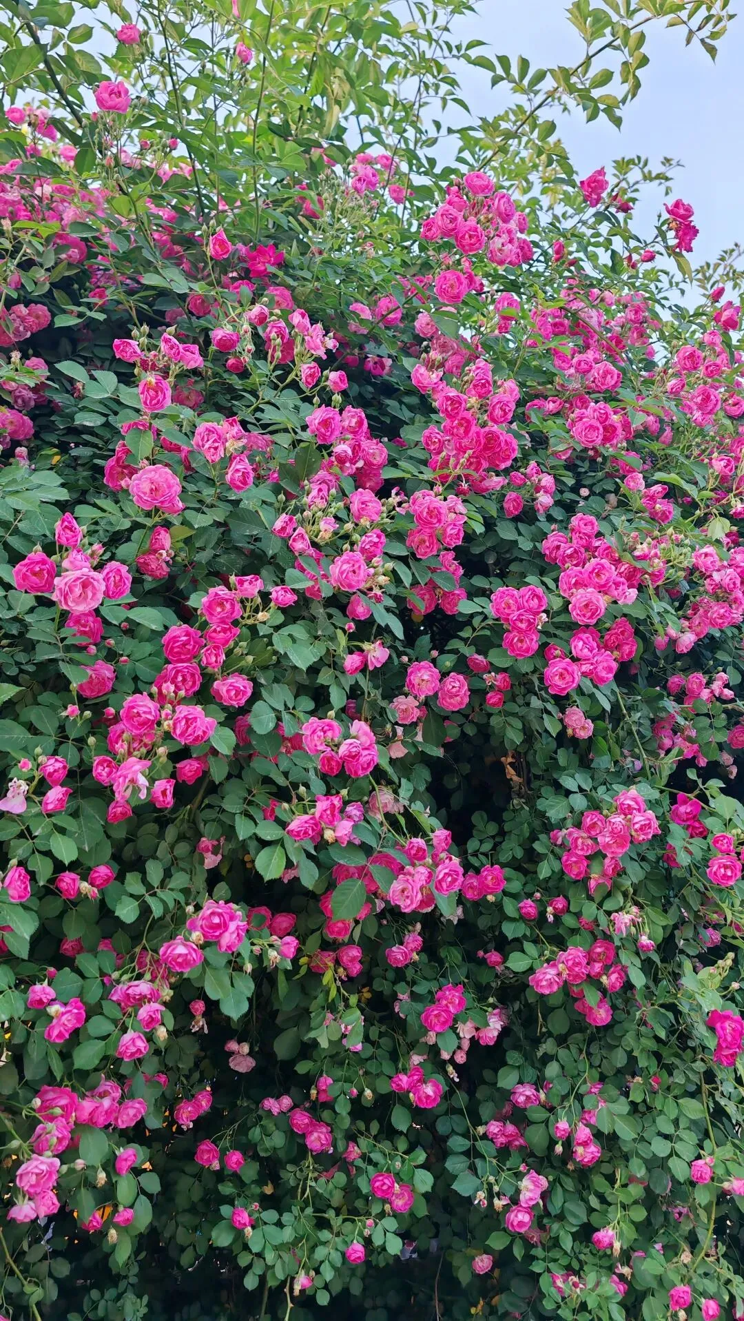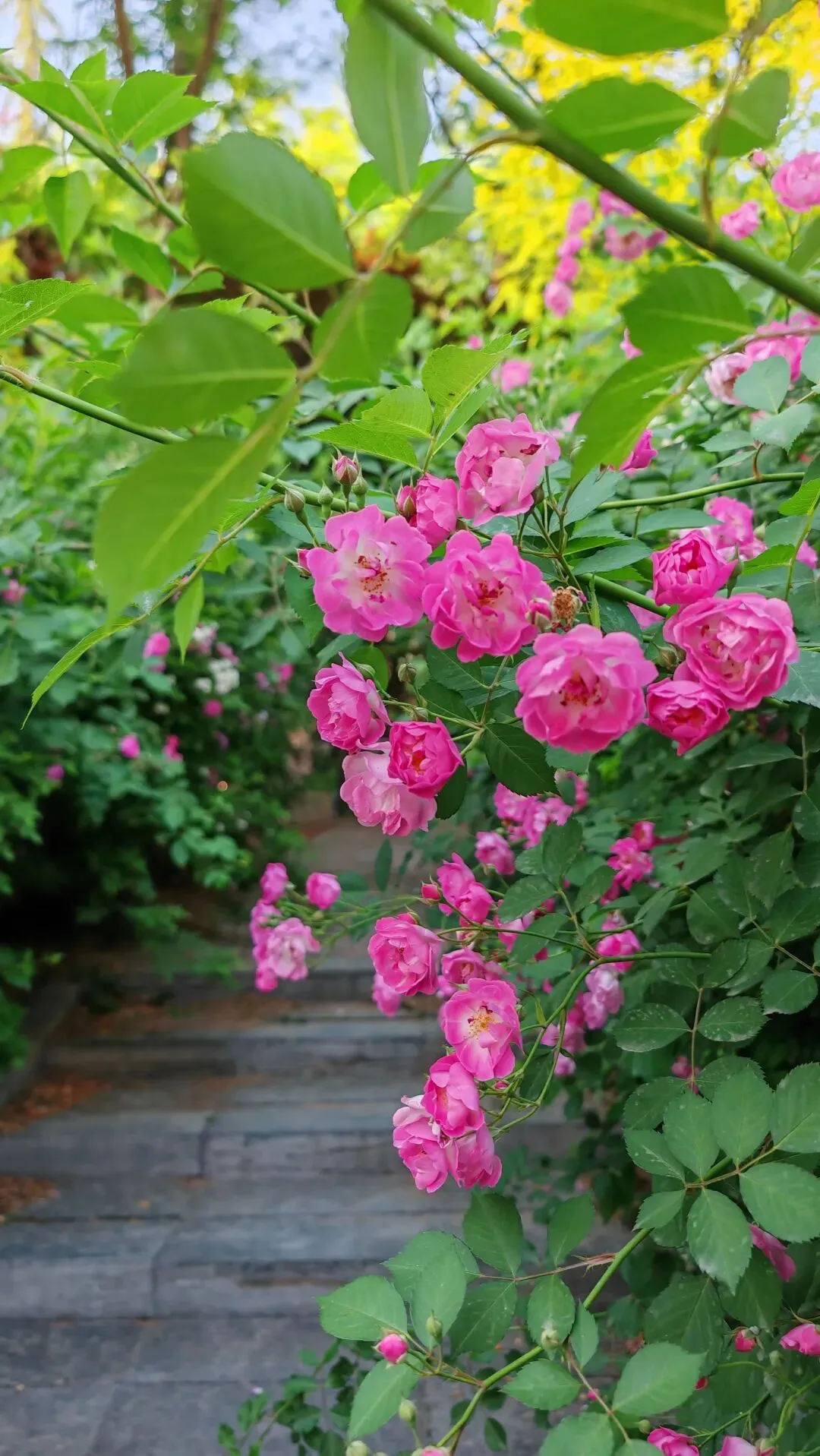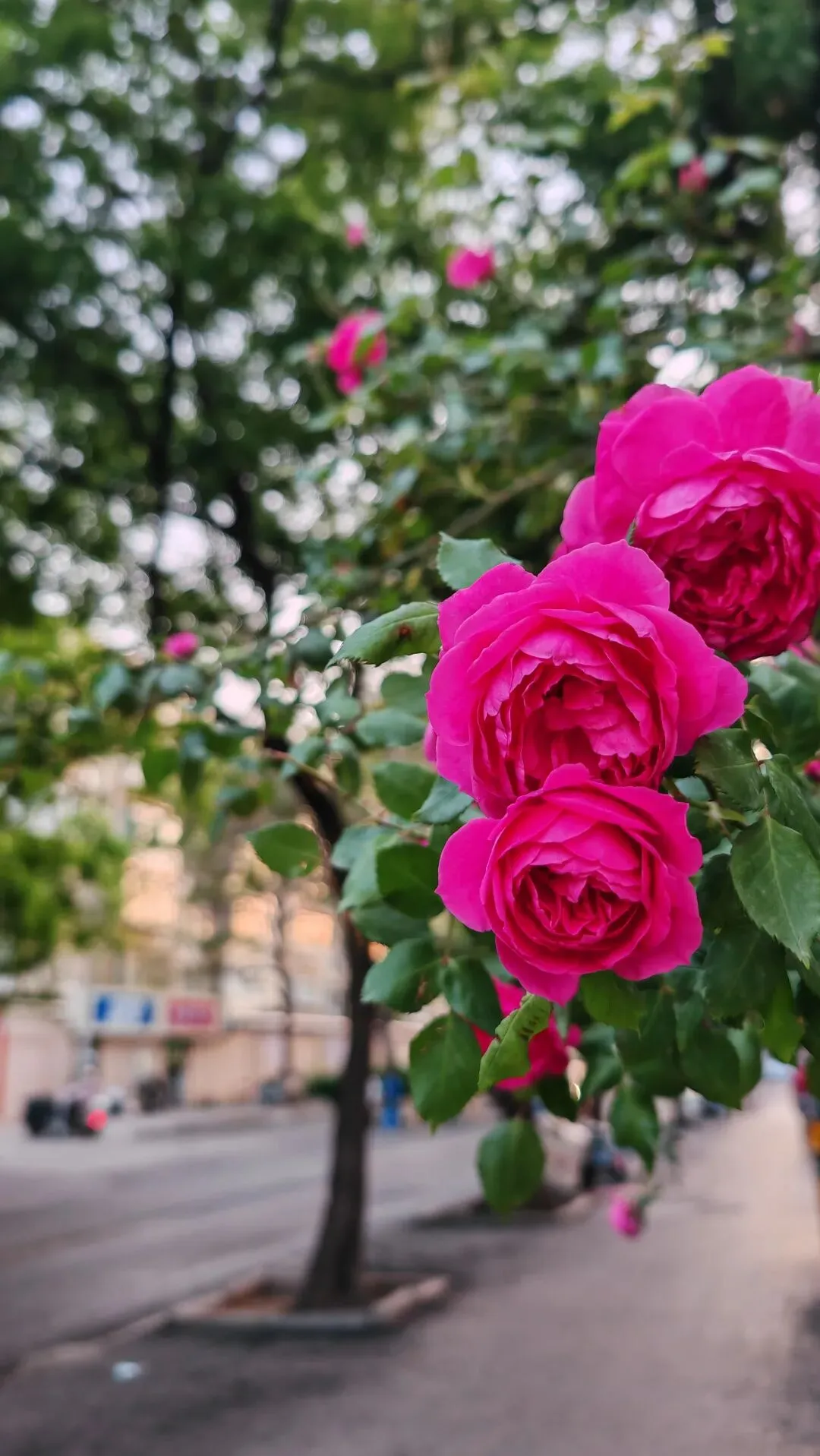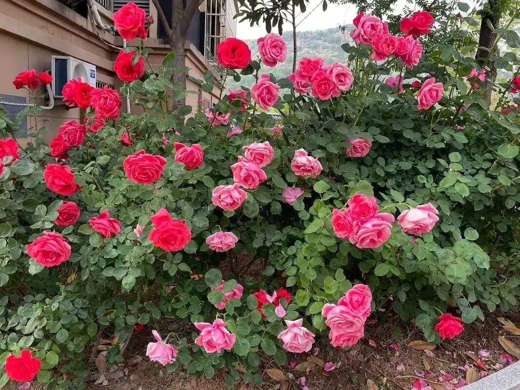 漫步街头巷尾,月季的身影无处不在,勾勒出独属于这座城市的春日画卷。小区与单位的围栏上,爬藤月季顺着栏杆肆意生长,枝蔓缠绕,繁花倾泻而下,宛若流动的花之瀑布,粉的温柔、红的热烈,层层叠叠的花瓣簇拥在一起,浪漫又活泼,为硬朗的建筑平添了几分柔情。