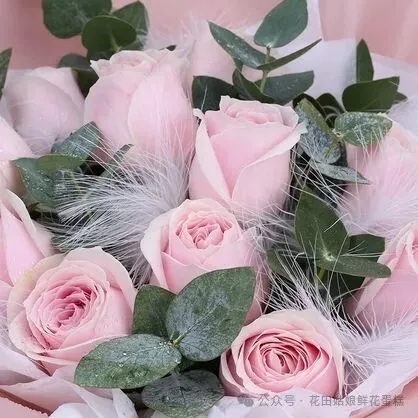 材料:11支精品粉雪山玫瑰,搭配适量尤加利羽毛。