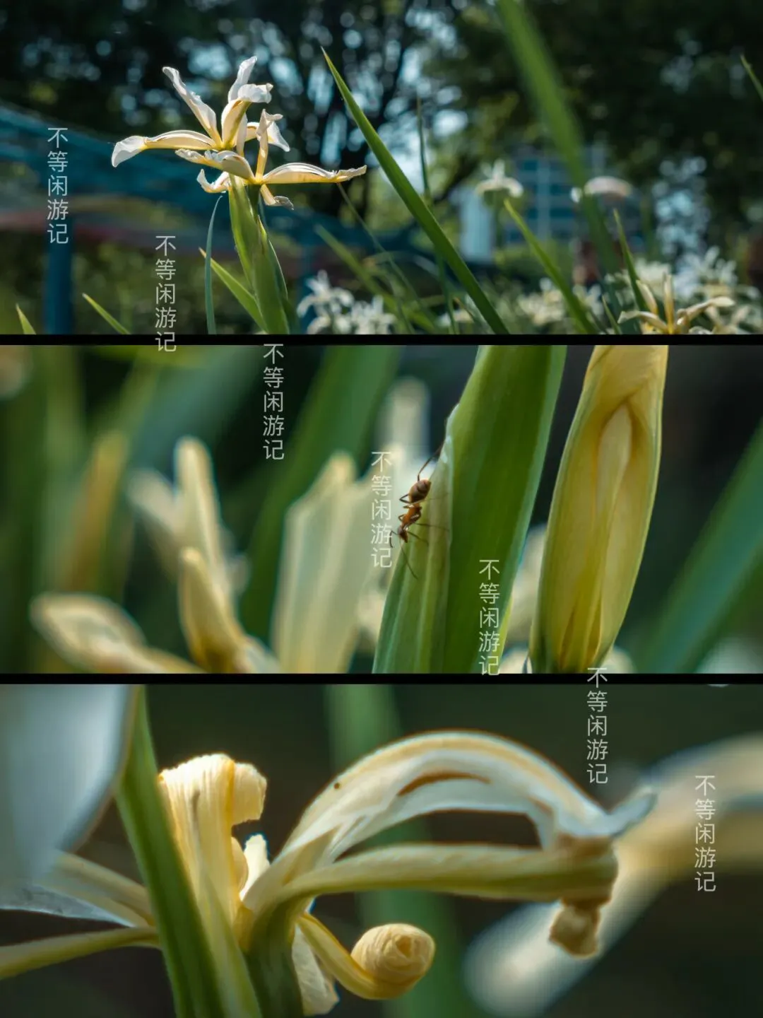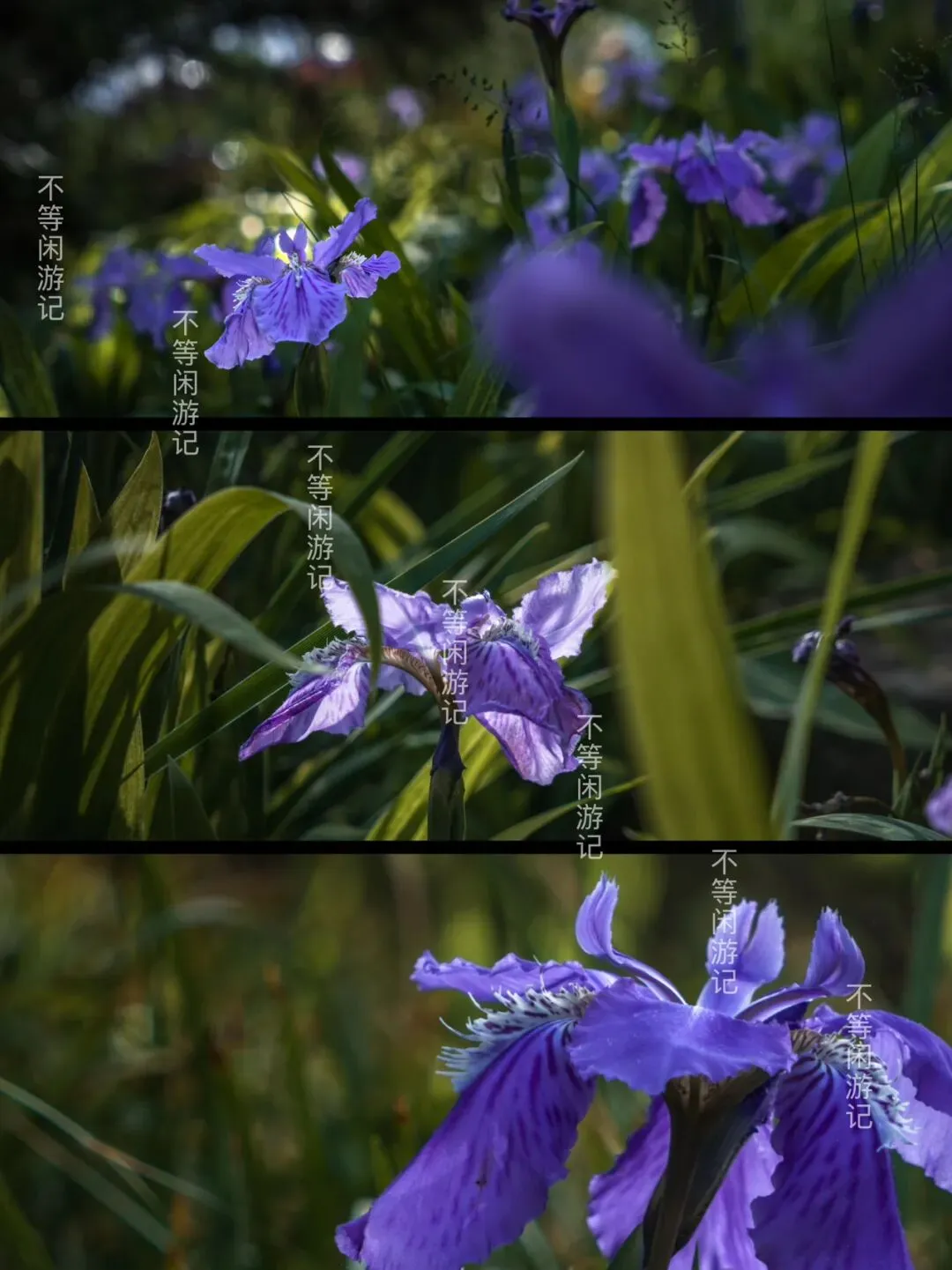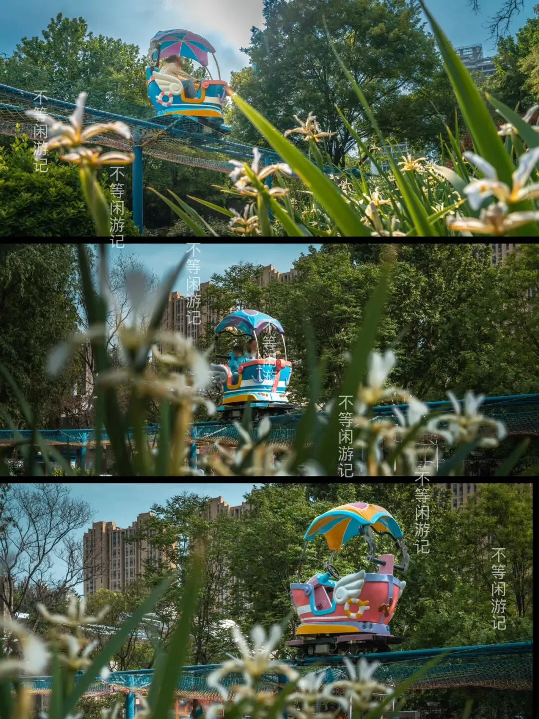紫色、白色的鸢尾,开在一条绿野仙踪般的小路旁,低调中有些贵气。放低视角,空中的游乐飞车好像在花间穿梭。