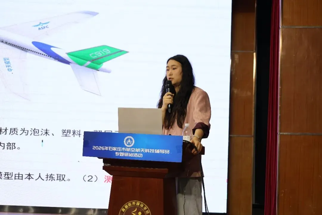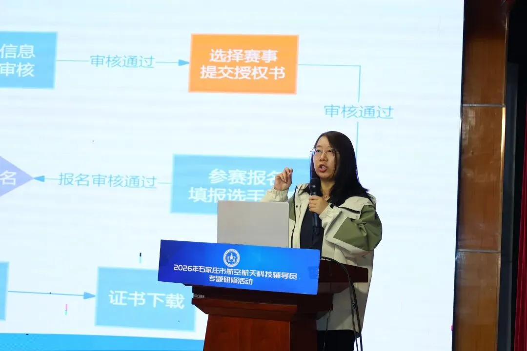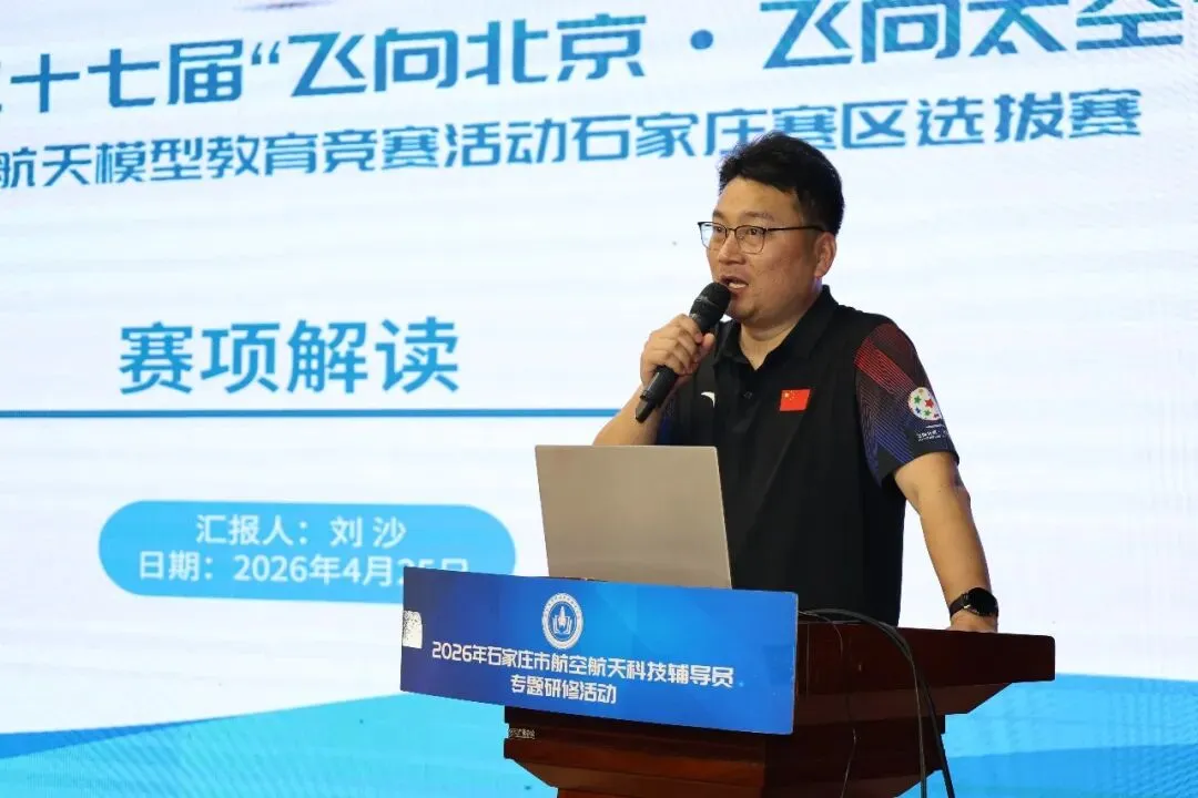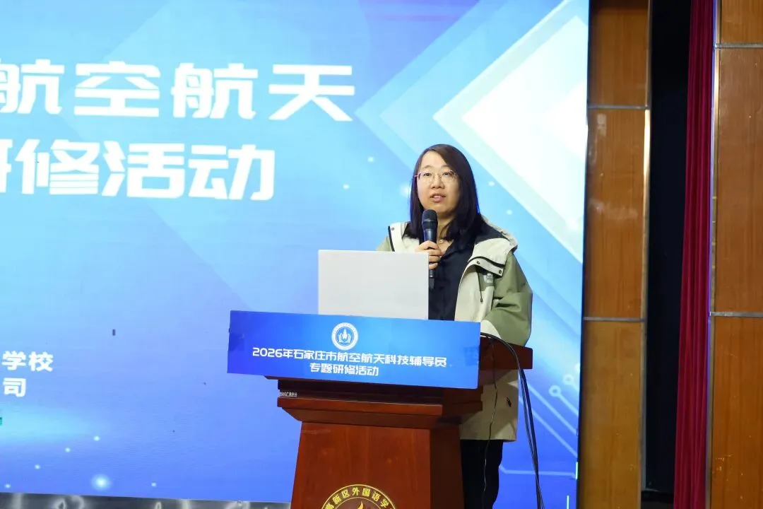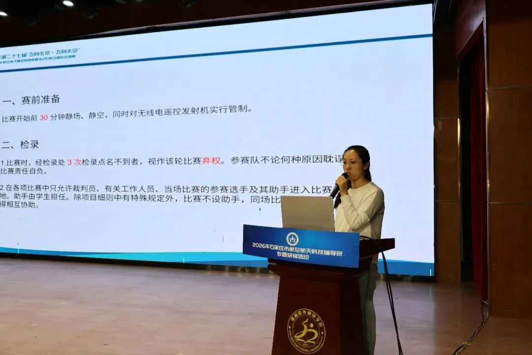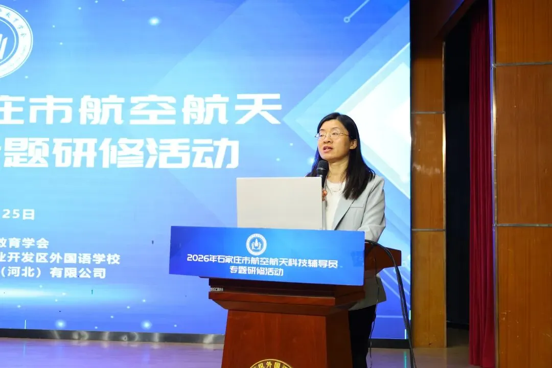 开班仪式上,石家庄高新技术产业开发区外国语学校执行校长高翠平欢迎辞,她说道,作为本次活动的承办单位,学校深感荣幸,将全力做好各项服务保障工作,为活动顺利开展保驾护航。随后,石家庄市科技创新教育学会副秘书长刘凯平致辞,她指出,本次培训是提升科技教师专业能力、为全市科技教育工作者搭建学习、交流、提升的平台,扎实推进赛事筹备工作的关键举措,鼓励全体参训教师珍惜学习机会,认真听讲、积极实践、深入交流,把所学知识转化为教学能力,把实践经验融入日常指导,以更专业的素养、更扎实的本领,引领青少年走近航空航天、热爱科学探索、勇于创新实践。专题讲座环节,石家庄市科技创新教育学会副秘书长刘凯平,围绕第二十七届“飞向北京·飞向太空”全国青少年航空航天模型教育竞赛活动进行整体介绍与赛项规则全面解读,清晰说明了赛事背景、赛项设置、赛程安排及备赛要点。